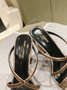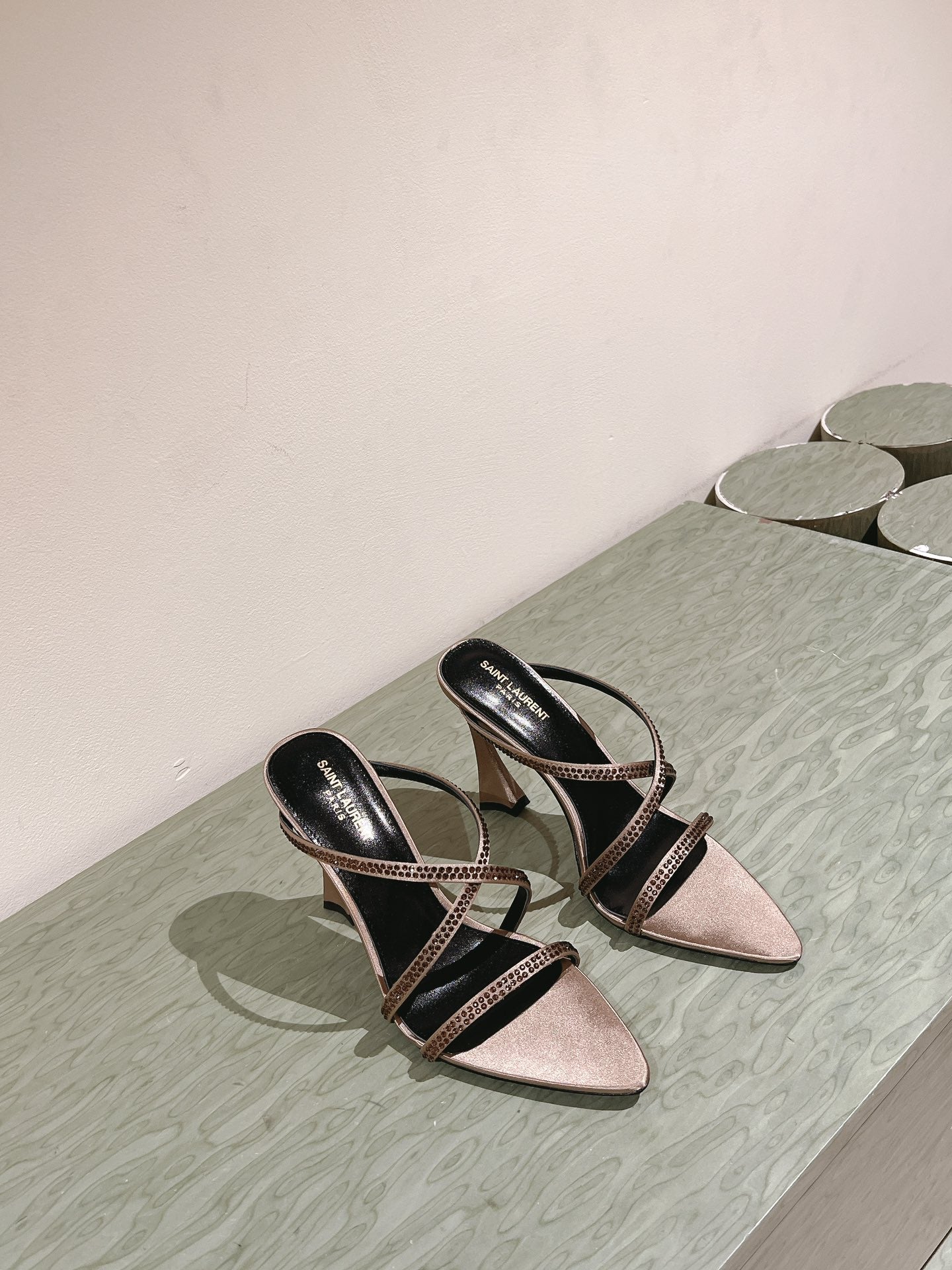 HIGH HEEL MULE 10 CM IN CAMEL BEIGE SATIN WITH RHINESTONES