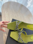 RAV HIGH HEEL 10 CM EMBELLISHED OLIVE GREEN SATIN MULES
