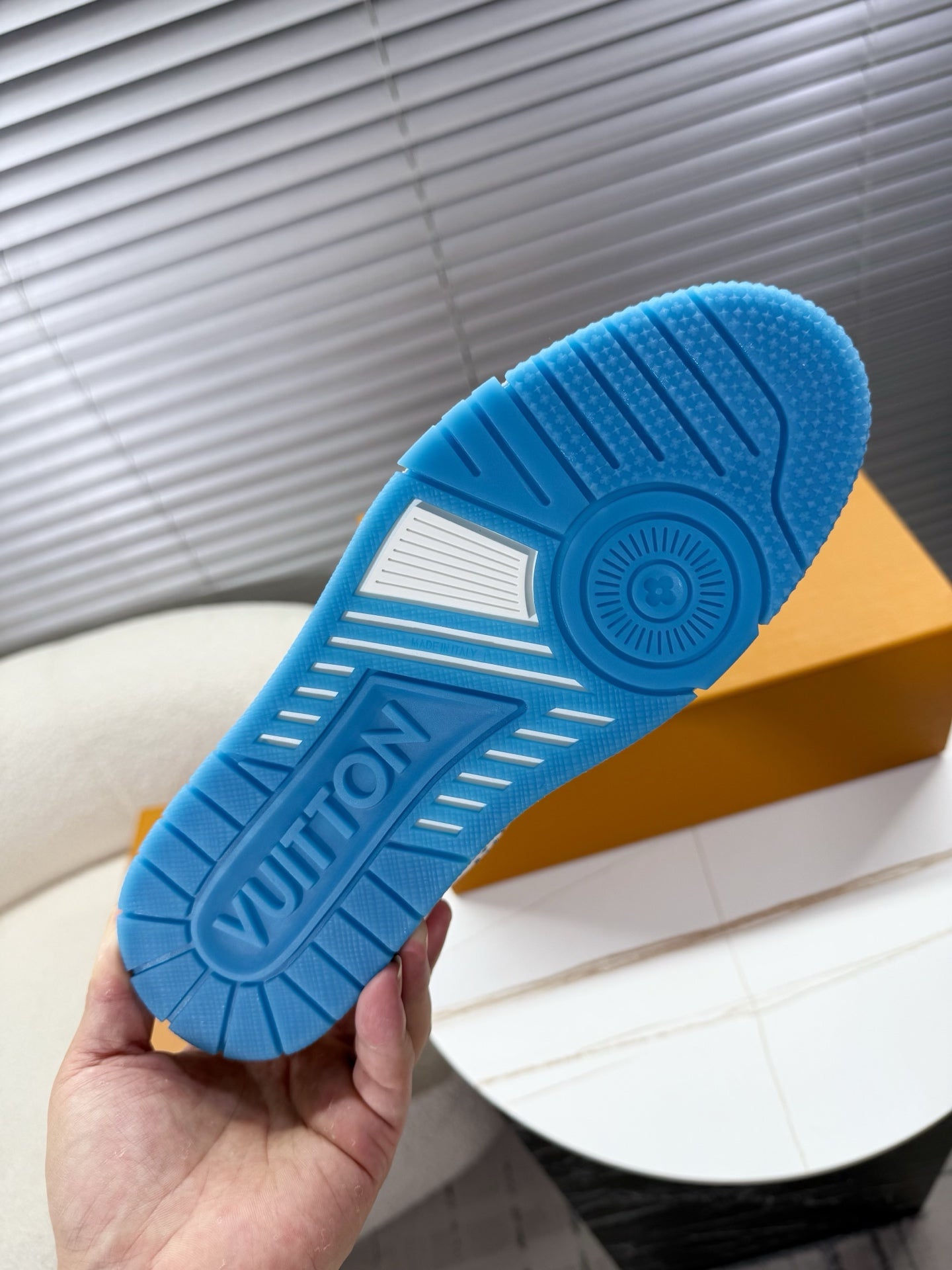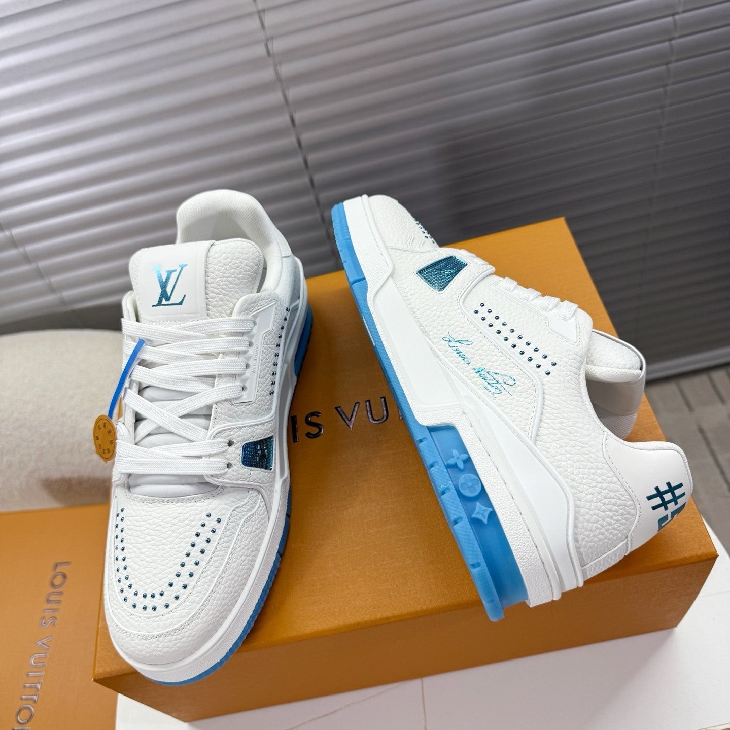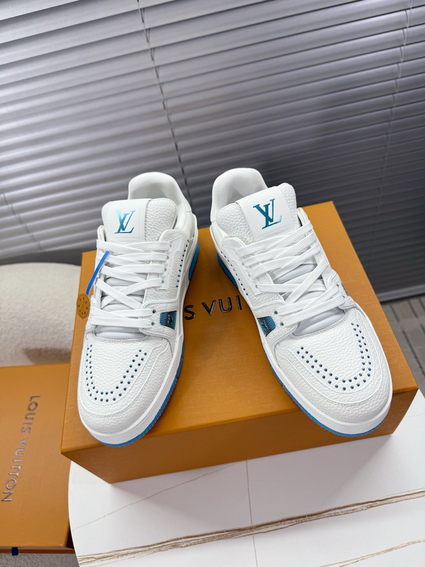 LV Trainer Sports Shoes White Blue Grained Calfskin 511757