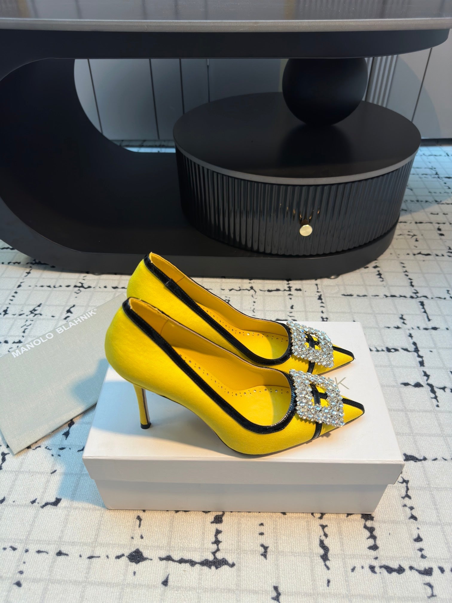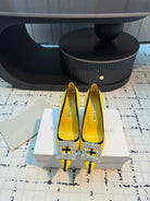 Hangisi 100 Yellow Linen with Black Leather Jewel Buckle Pumps 161072