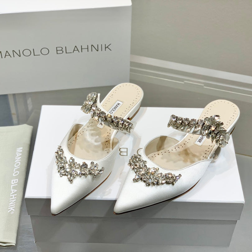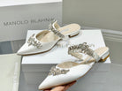 Manolo Flats Mules Crystal White Silk Satin 327471