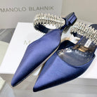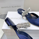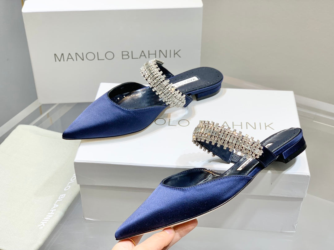 Manolo Flats Mules Diamond Buckle Navy Blue Silk Satin 327482