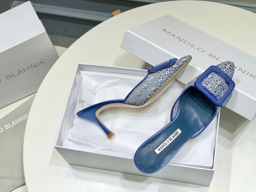 Manolo Mules 7cm Blue Hollow Lace Leather Bottom 451199