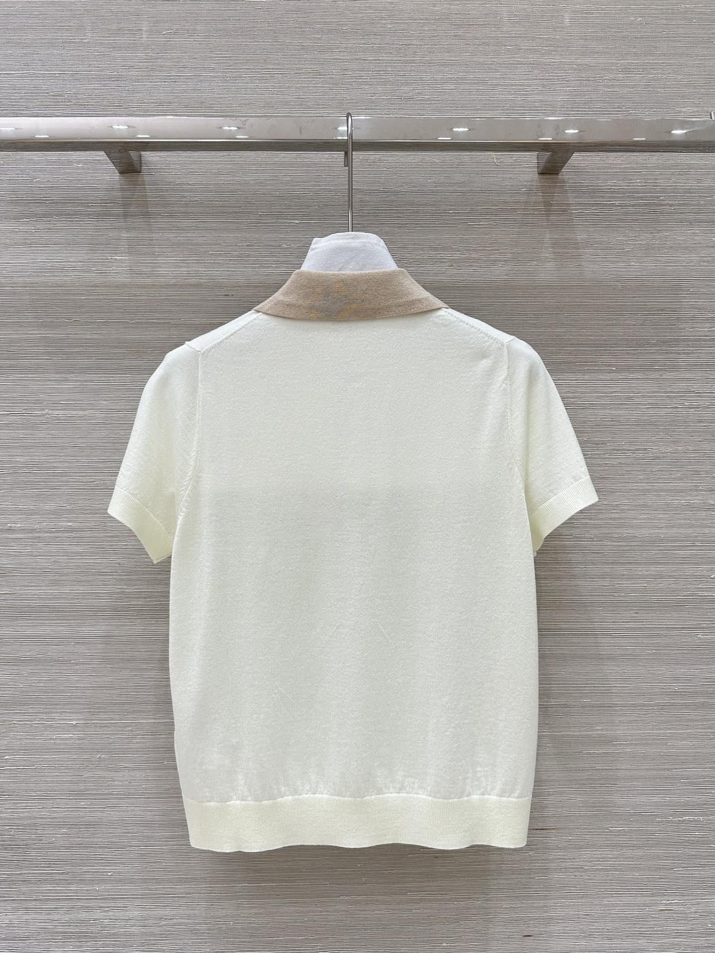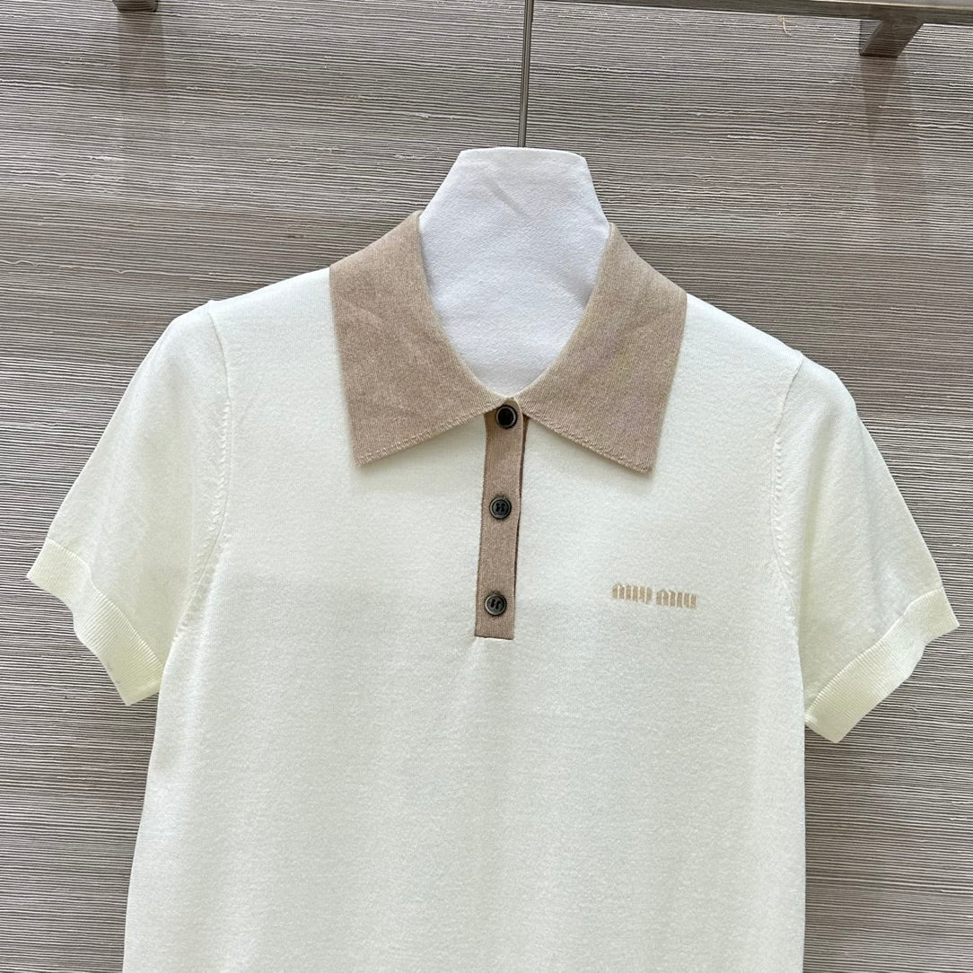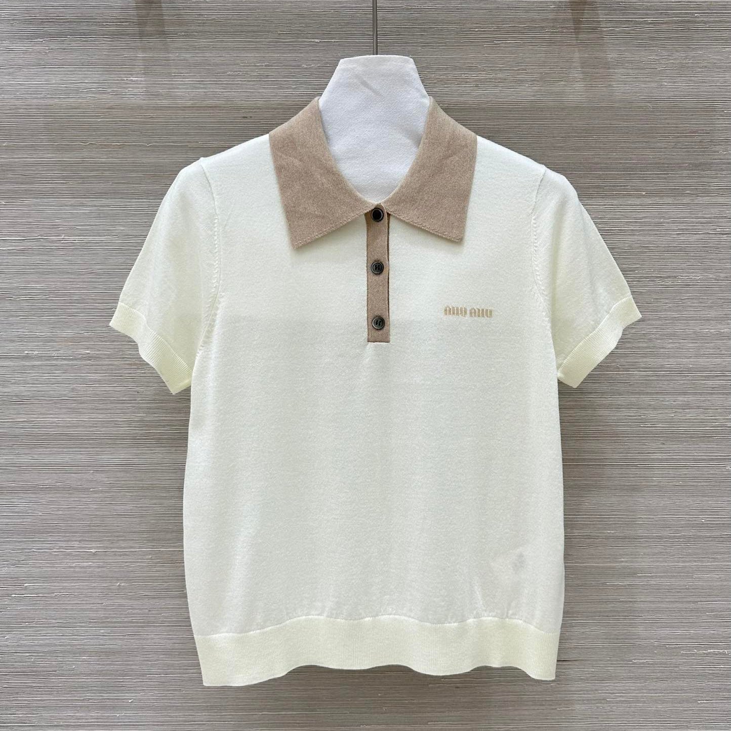 Miu Miu 25 Polo Collar Short-sleeve Knitted Top Beige Wool