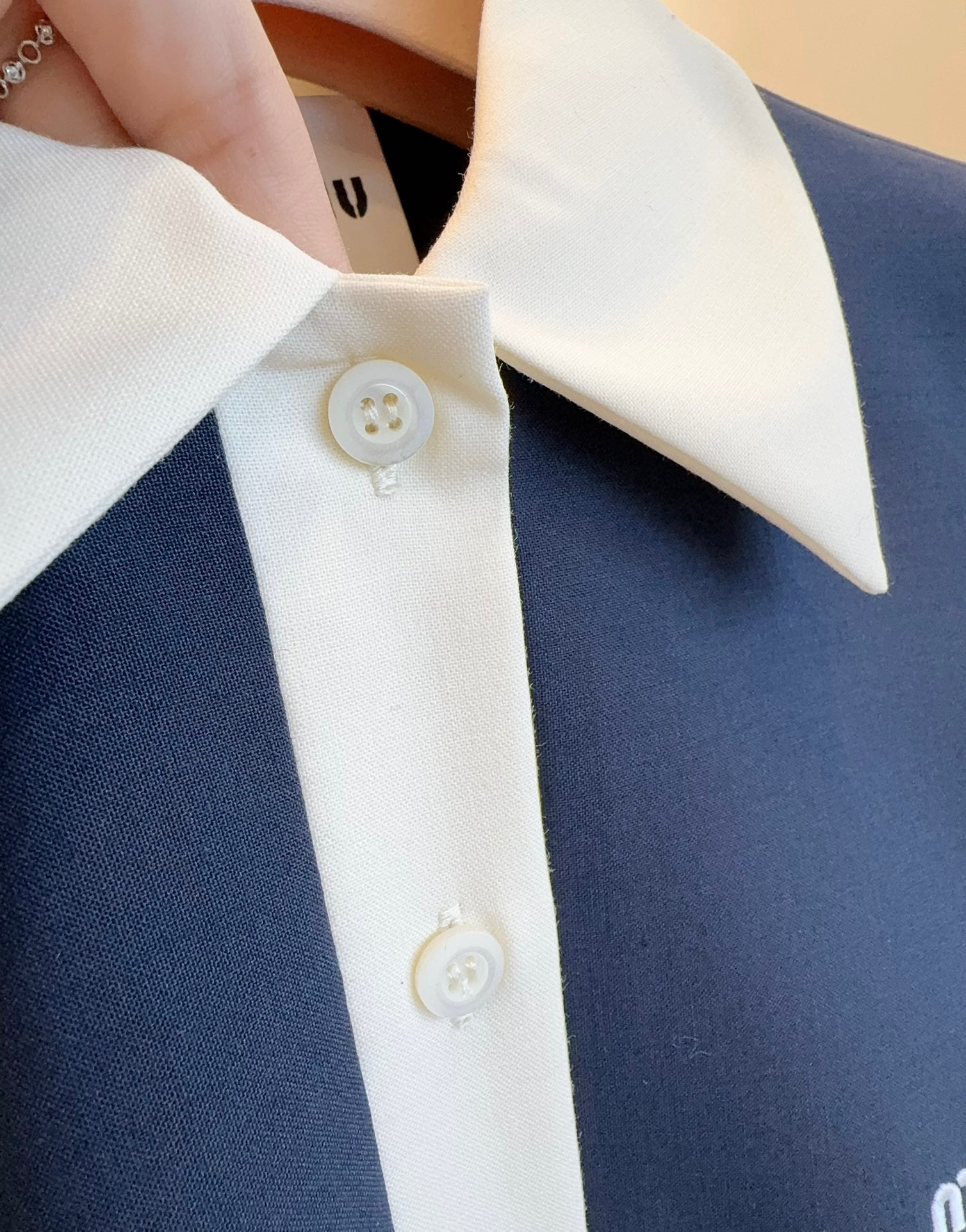 Miumiu 2025 Short-sleeved Pleated Dress Navy Blue Cotton