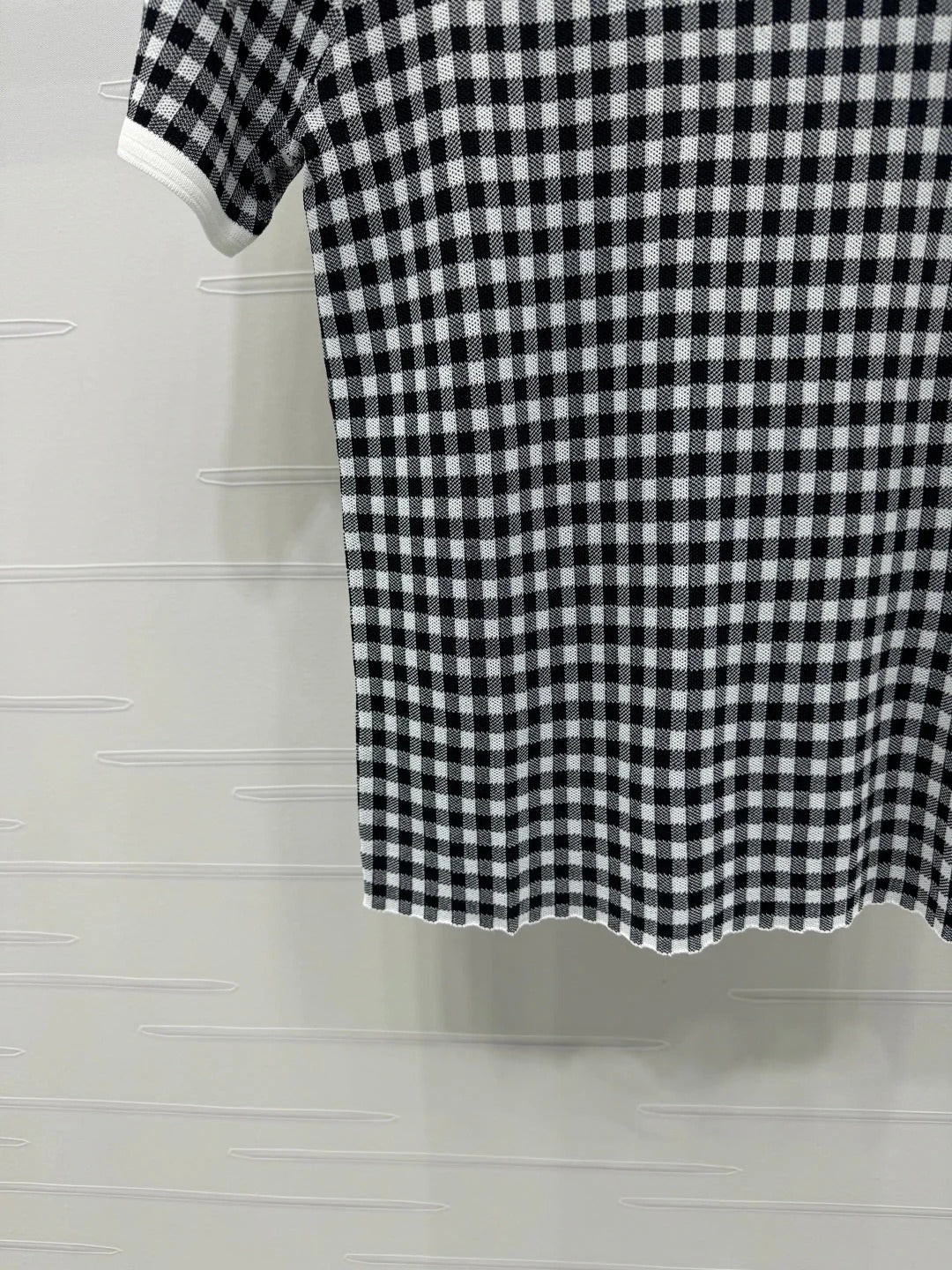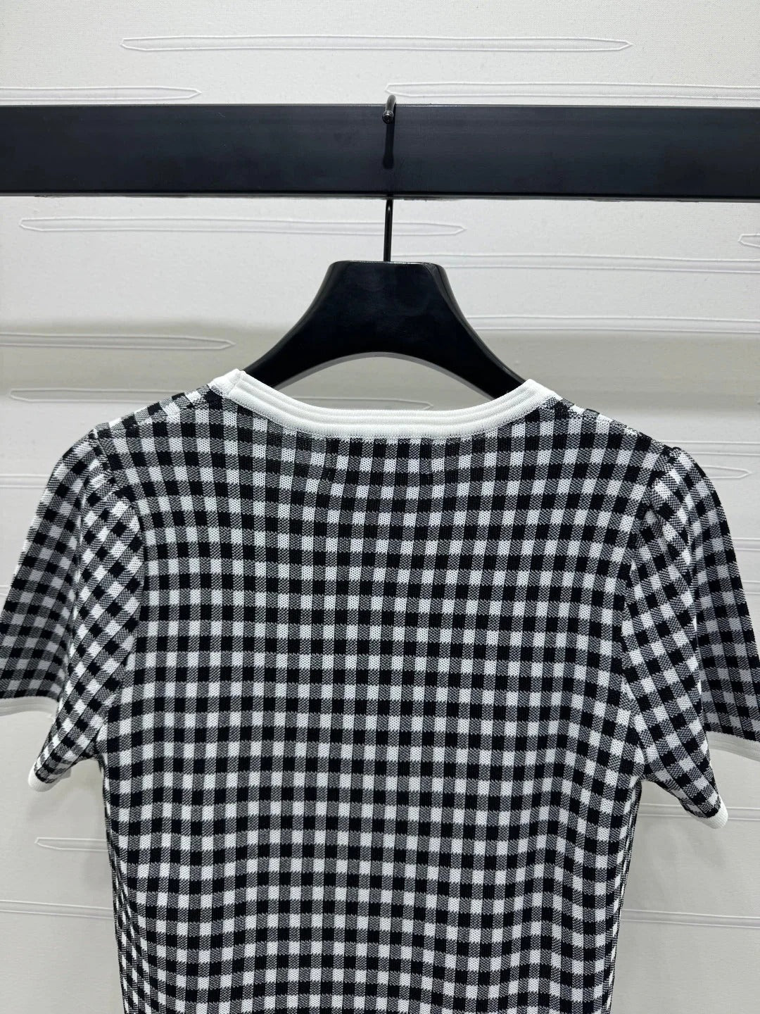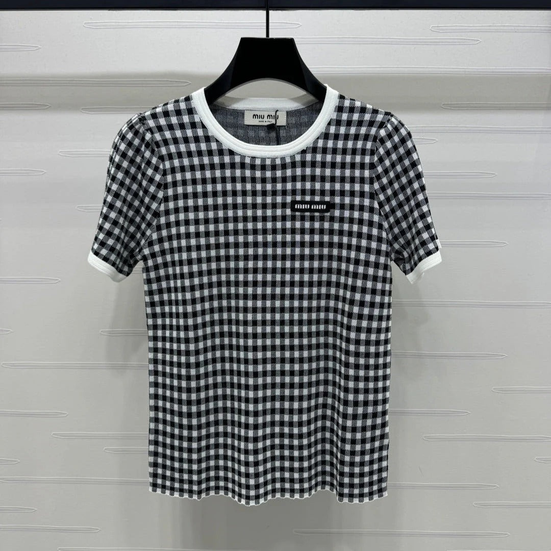 MIUMIU CREW NECK SHORT-SLEEVE PLAID KNIT TOP 274833