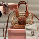 WOVEN HOLLOW BAG 18 IN BEIGE RATTAN AND BROWN CALFSKIN TRIM
