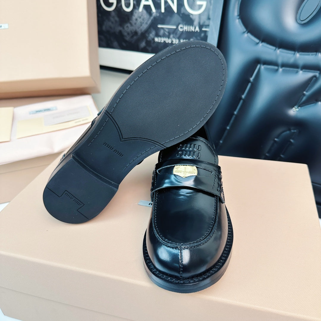 Miu Laces Eyelet Flat Loafer Black Sheepskin 498170