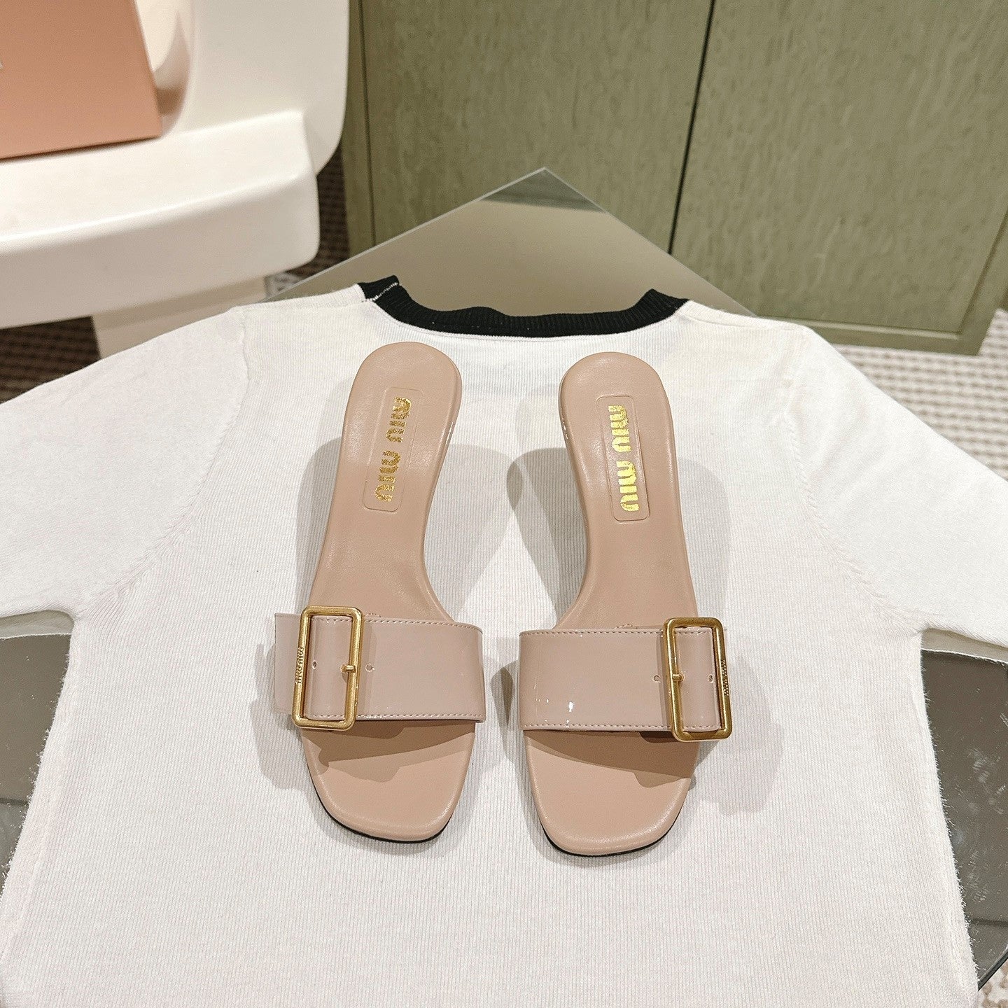 Miu x Balanc Studded Buckle Elegant Mules 45mm Beige Patent Leather 445869