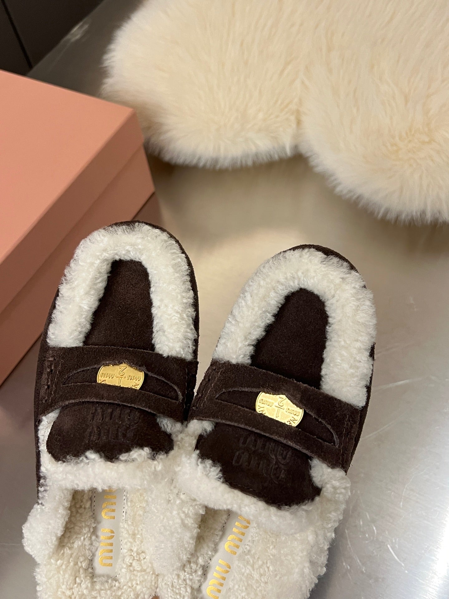 Miu Logo-Embossed Slippers Deep Neutral Suede Shearling 455920