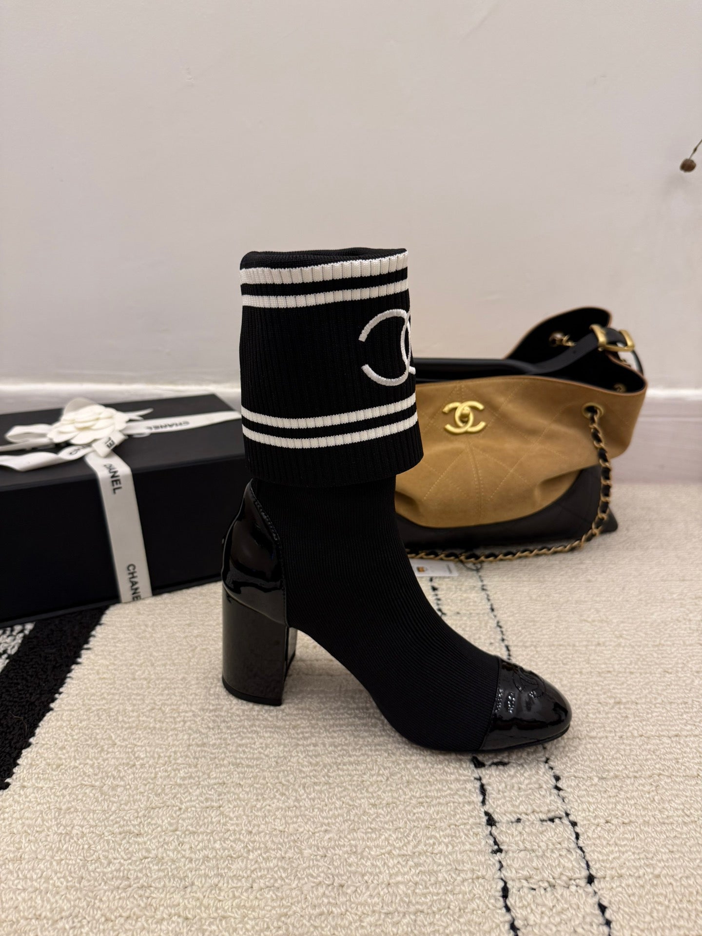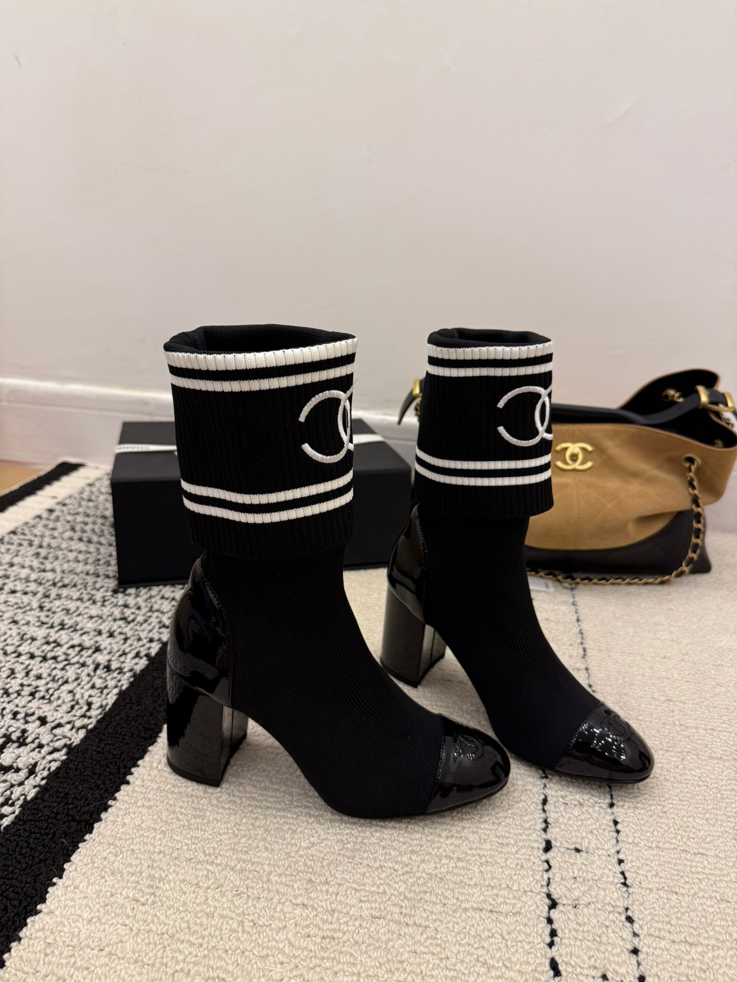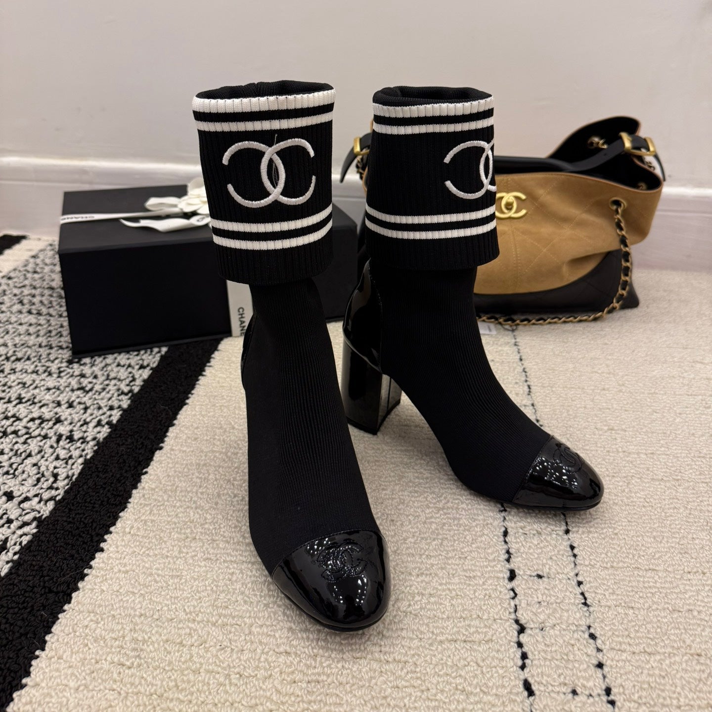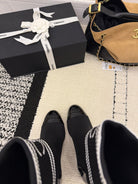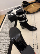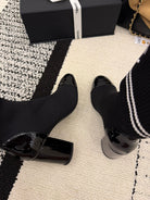 CC 2025 Chunky Heel Sock Boot Black Leather Knit 548117