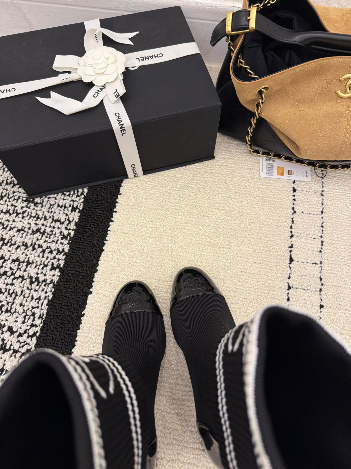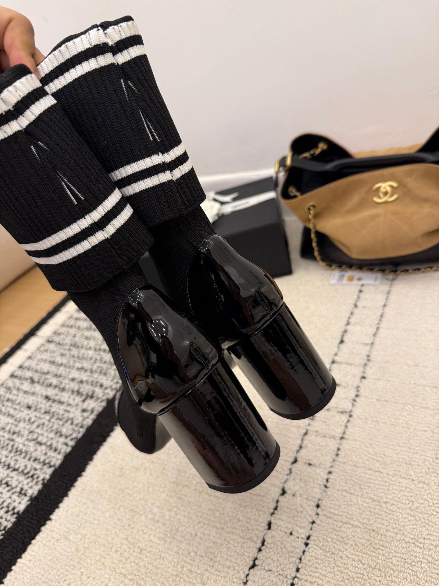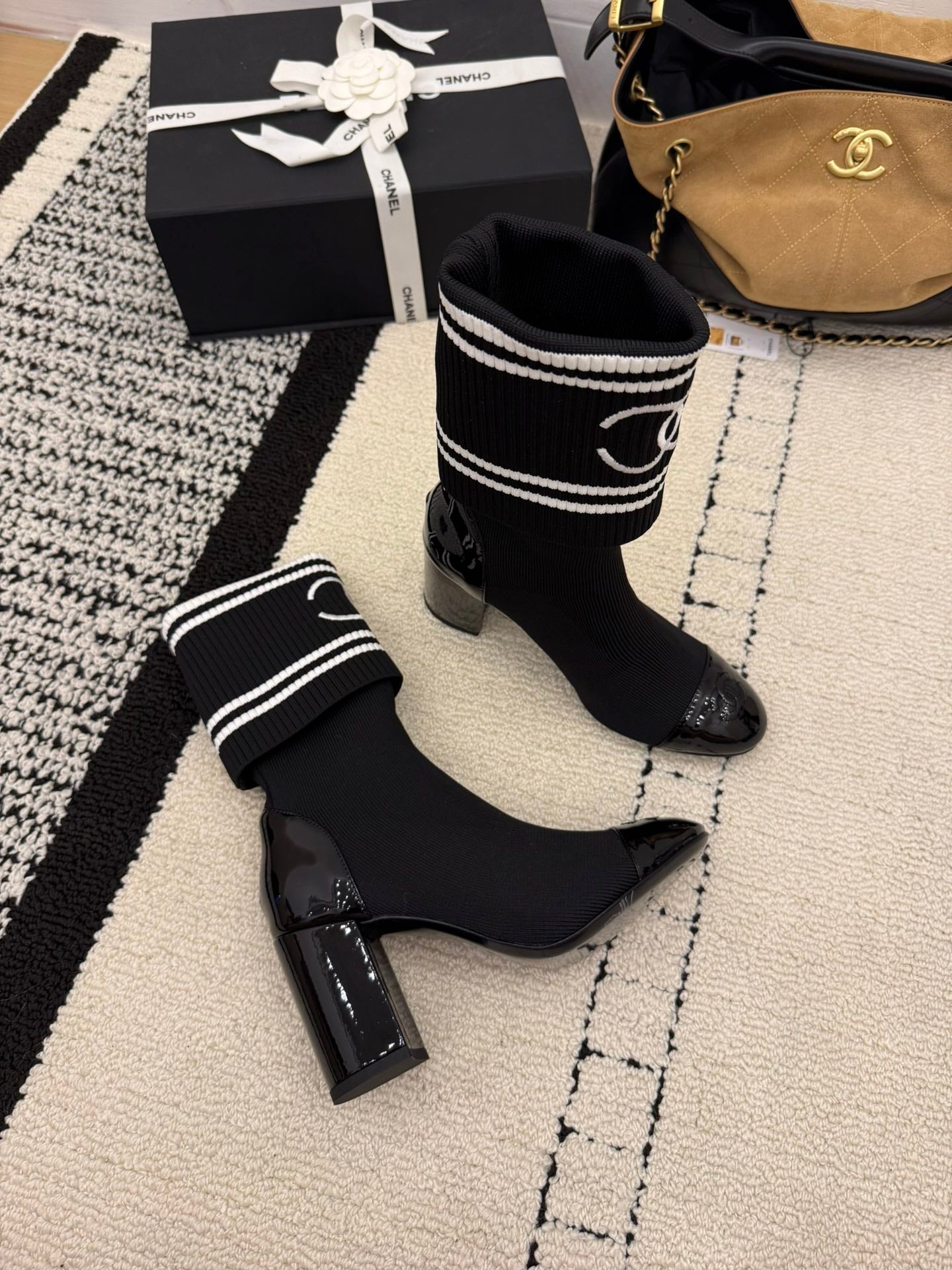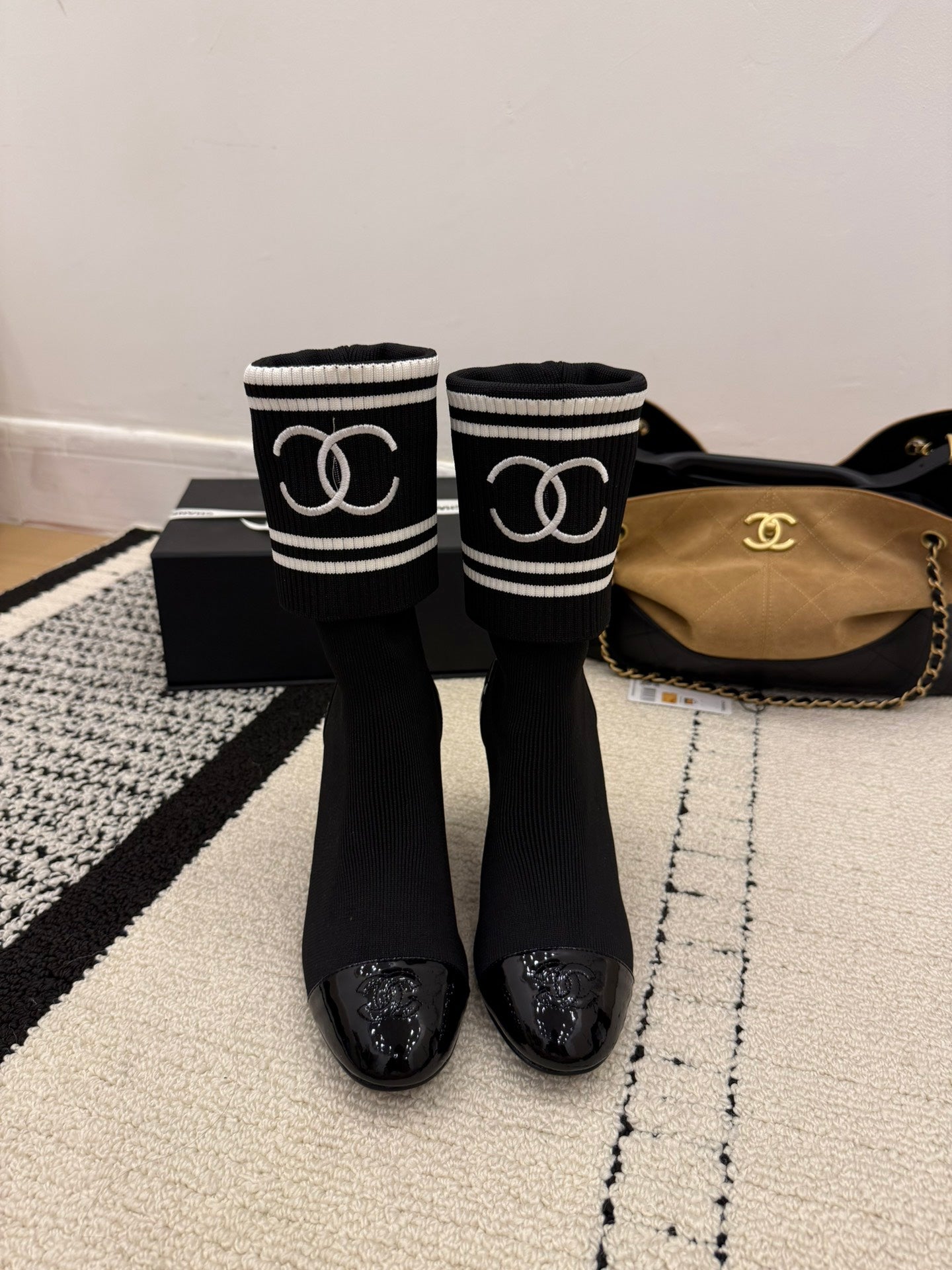 CC 2025 Chunky Heel Sock Boot Black Leather Knit 548117
