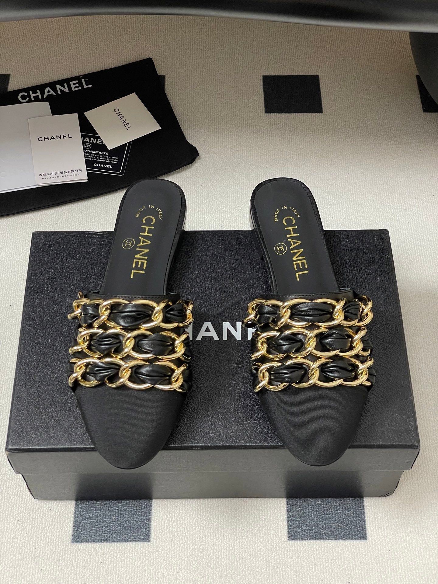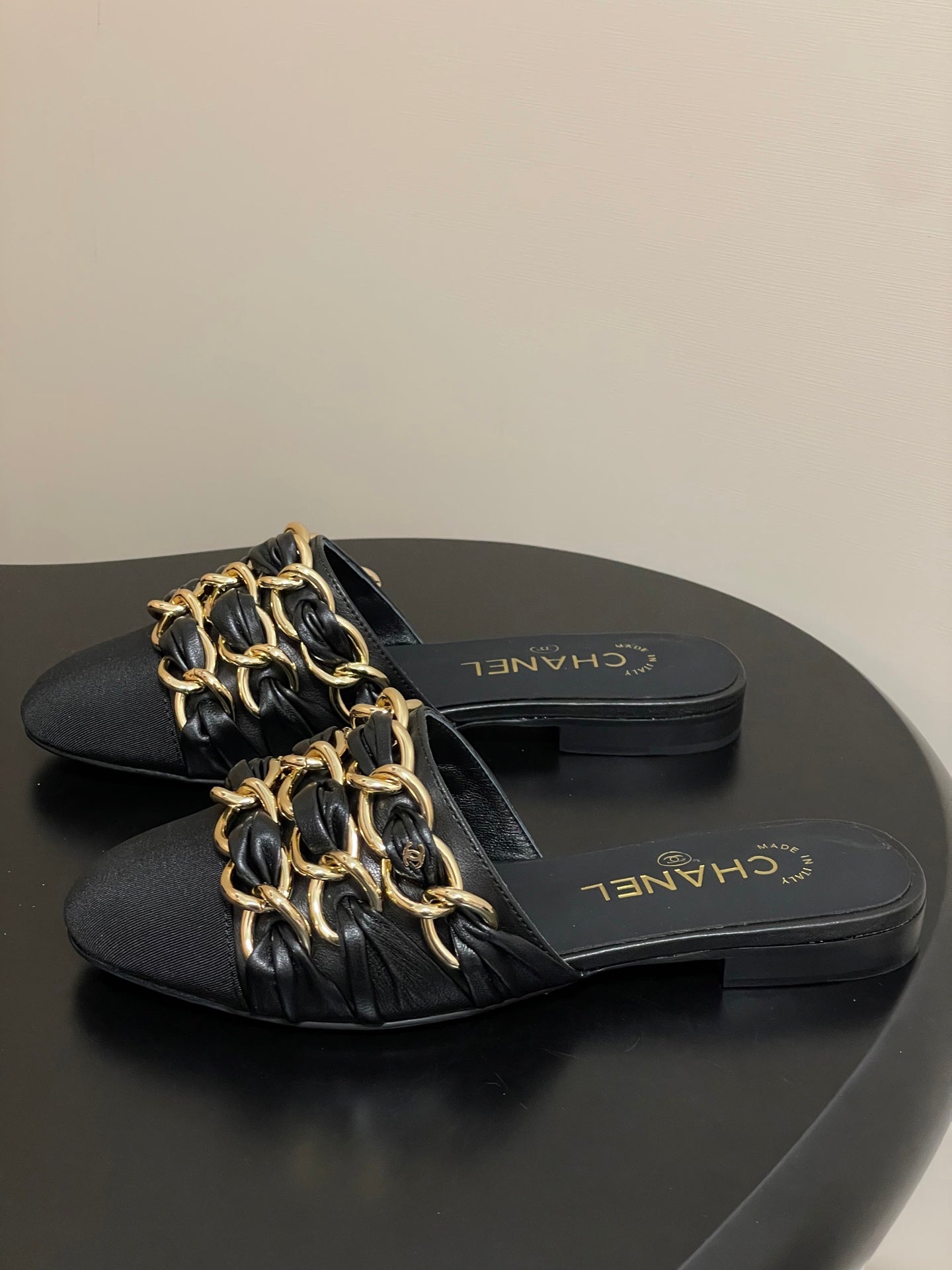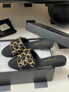 CC 25B Chain Closed Toe Flat Mule Black Sheepskin 393890