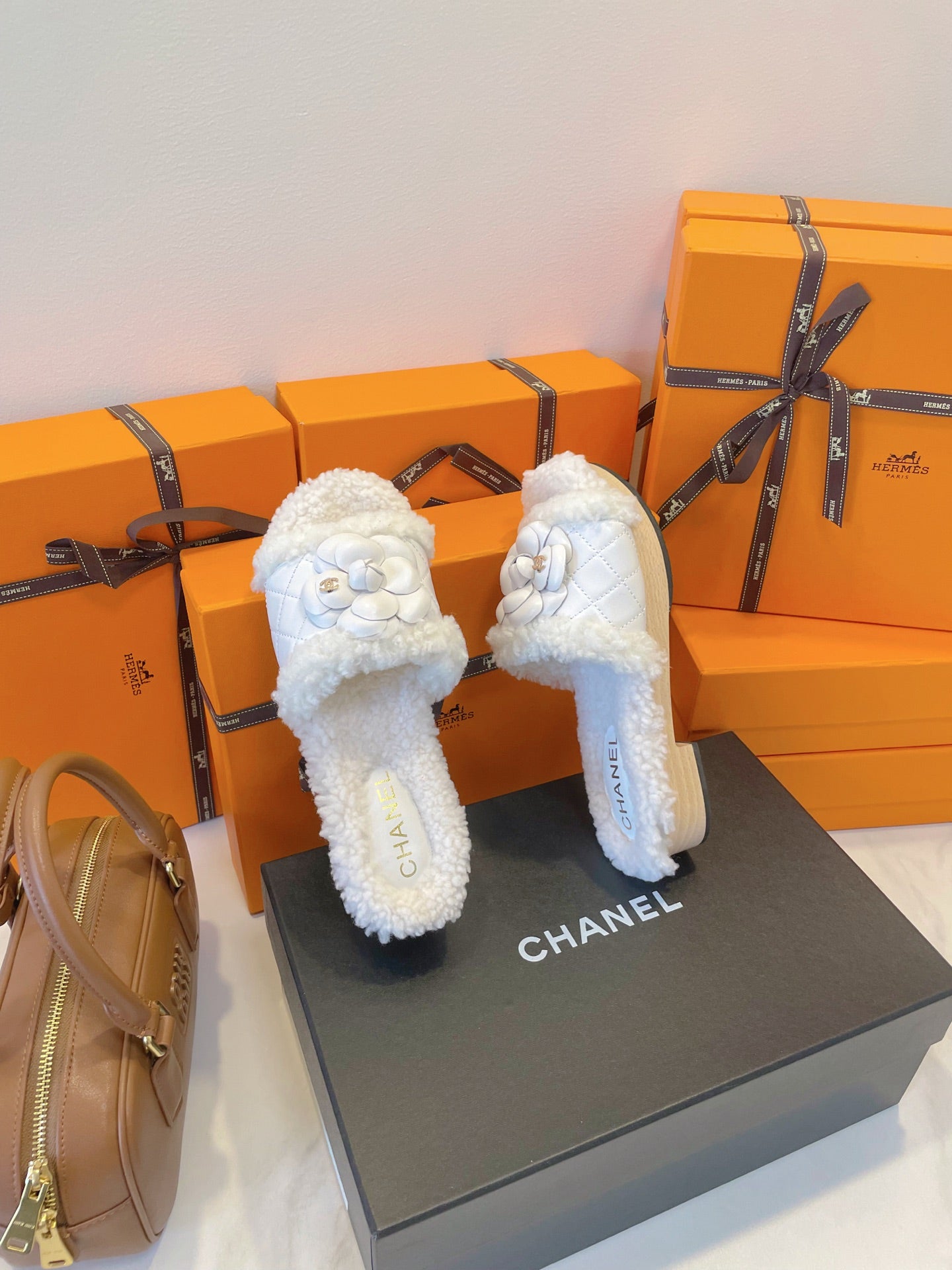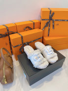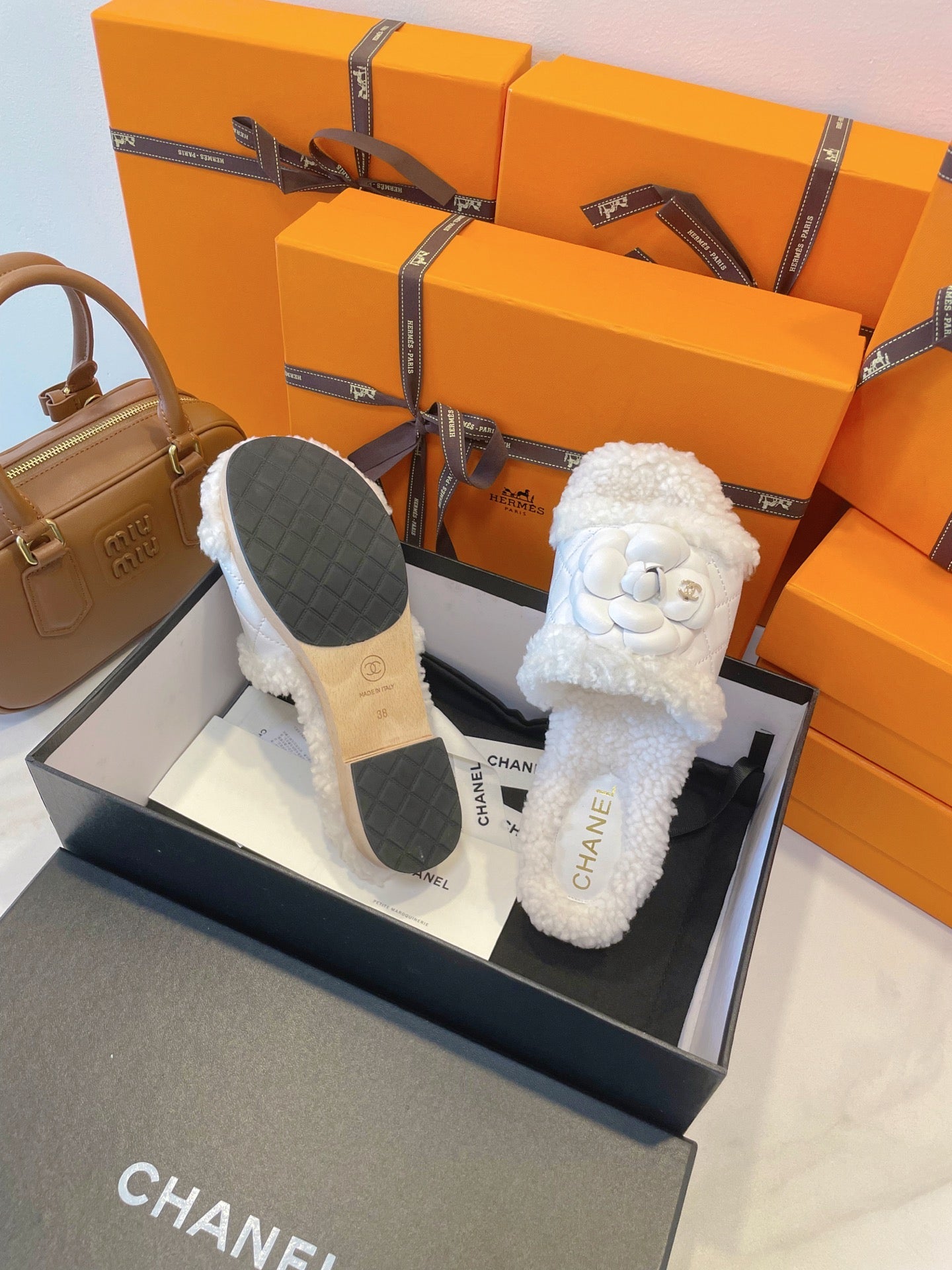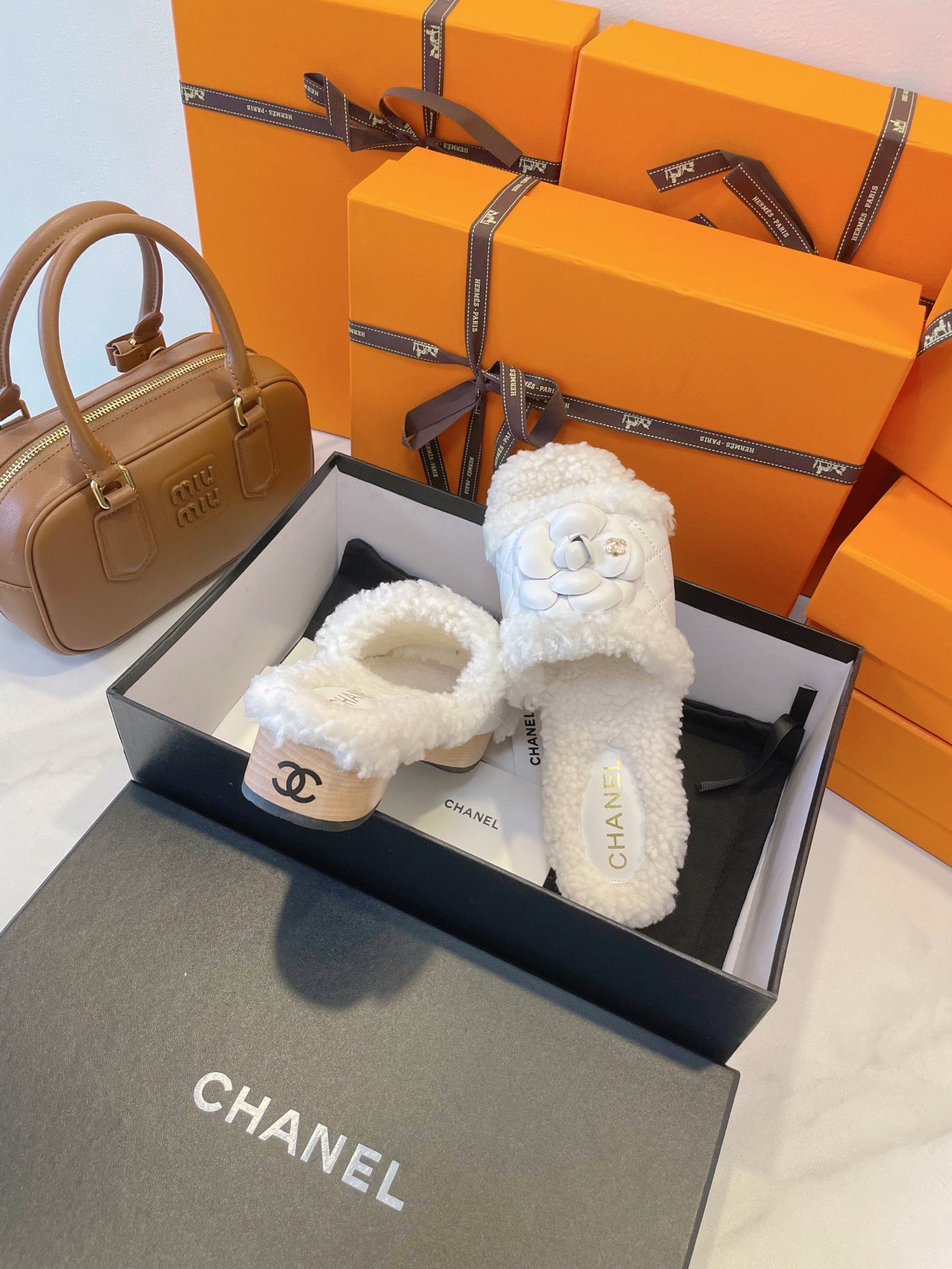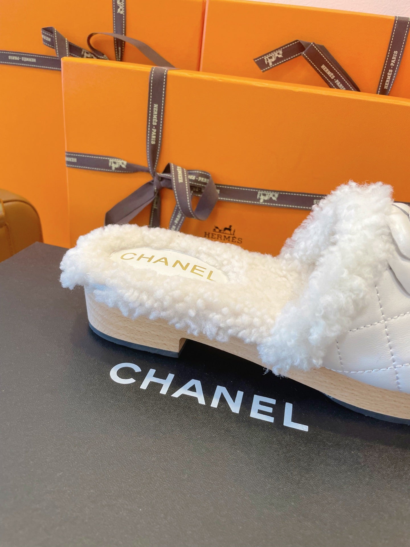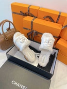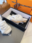 CC 25C Logo Slippers 50mm White Shearling Wood Sheepskin 423695