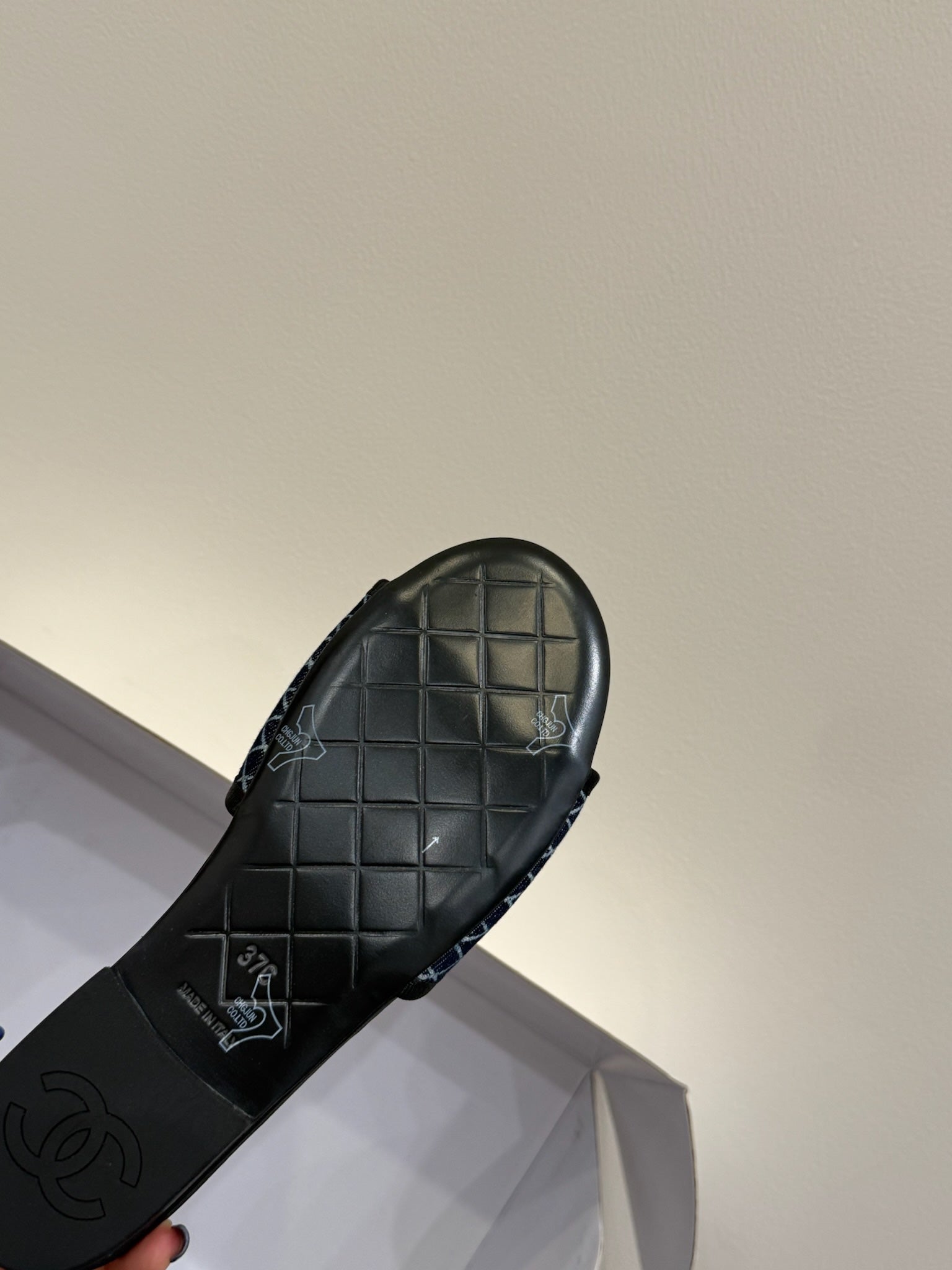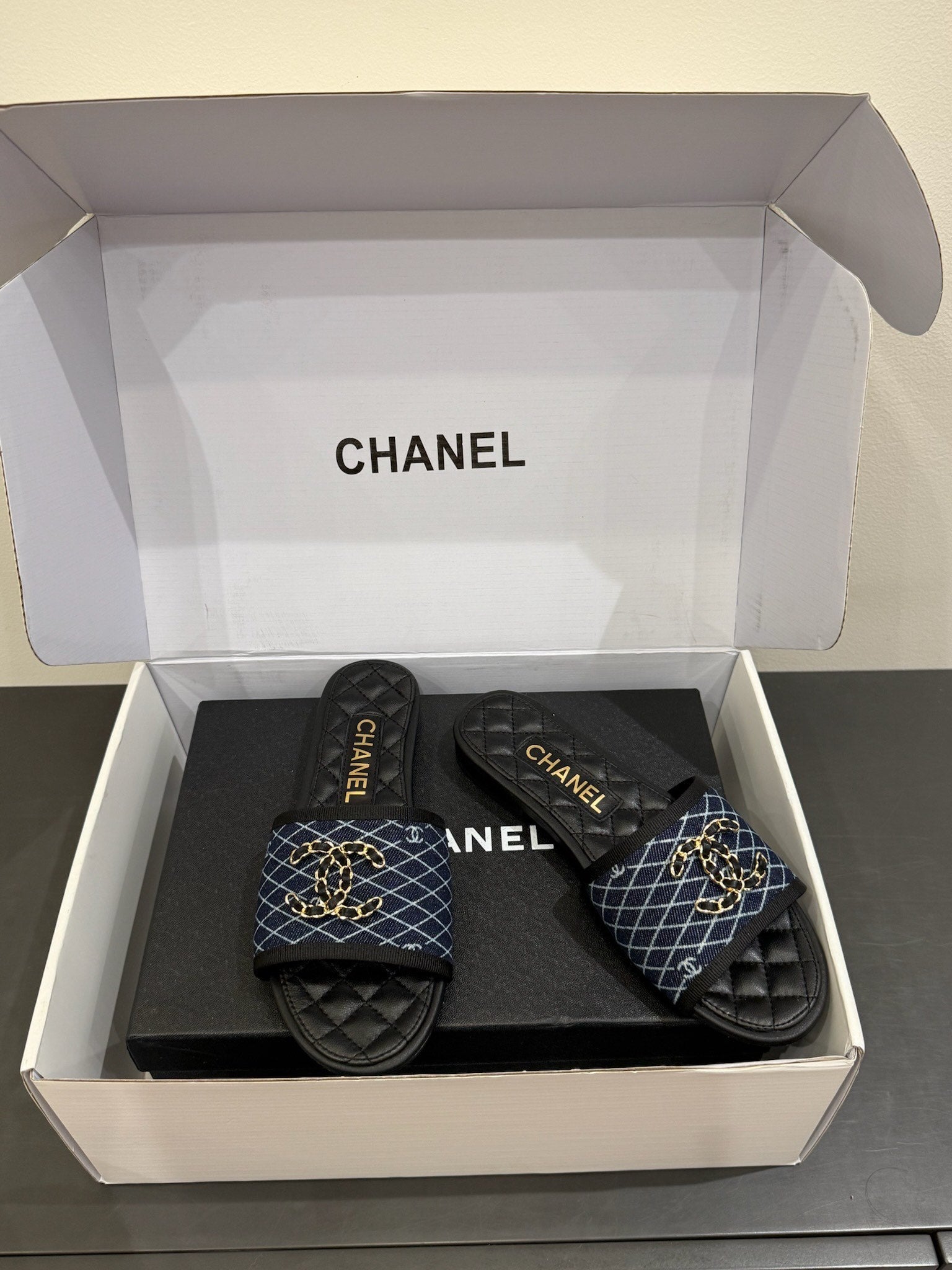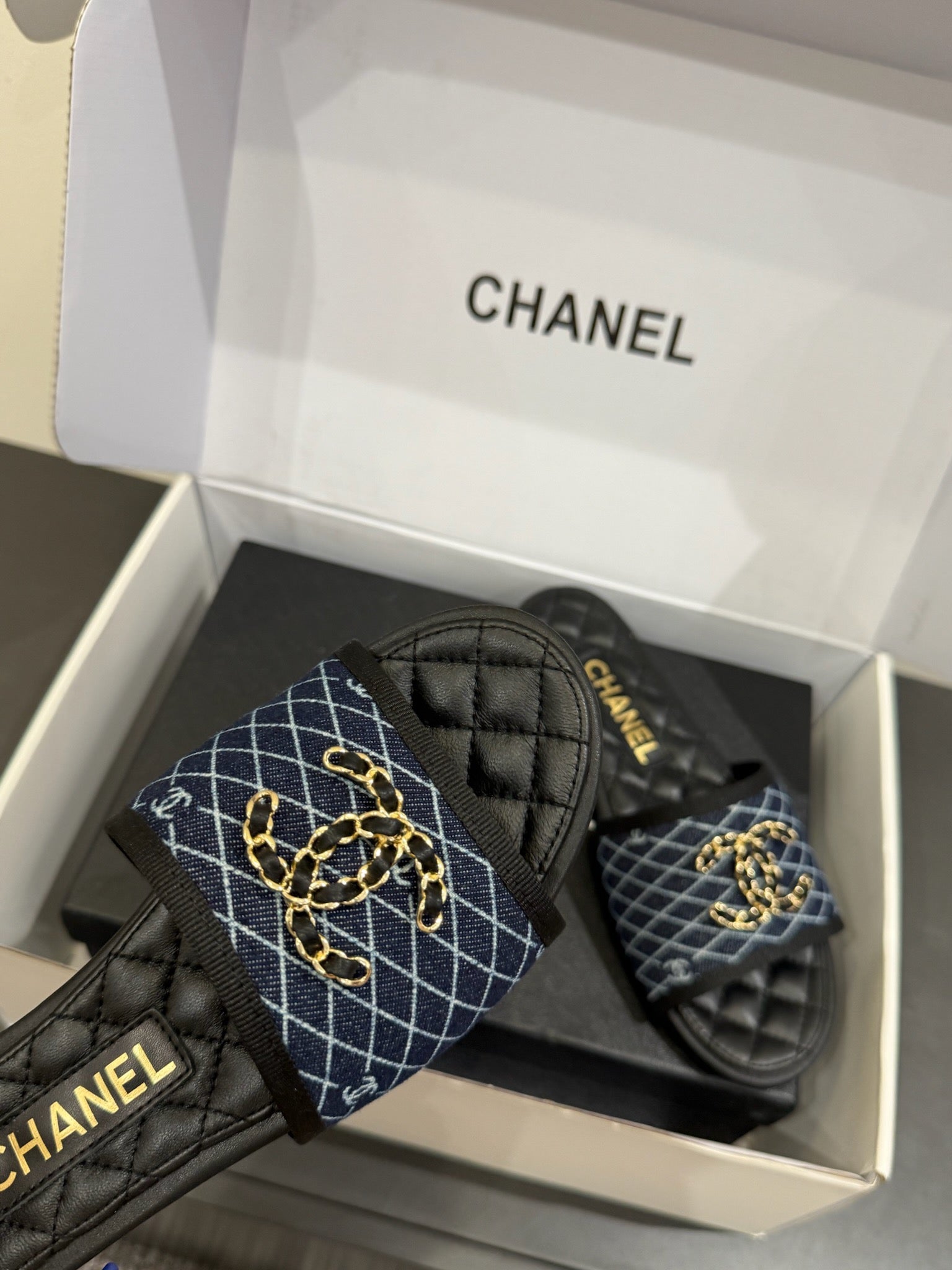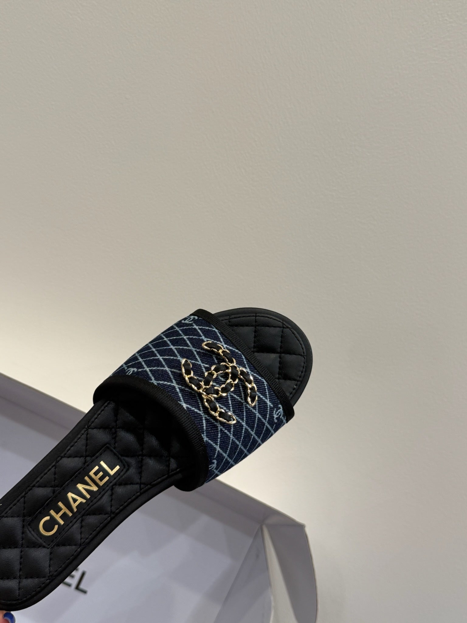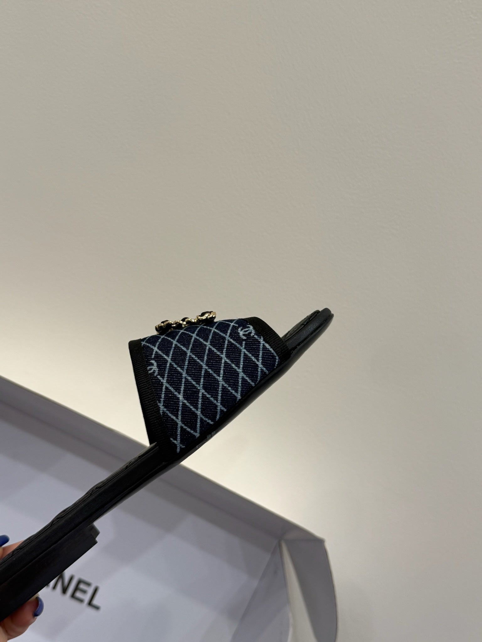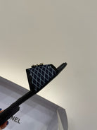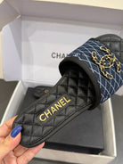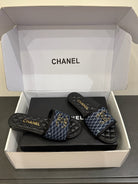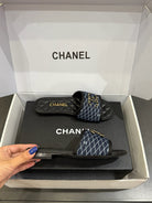 CC 25ss Chain Flat Slippers Black Blue Cowhide & Sheepskin 417564