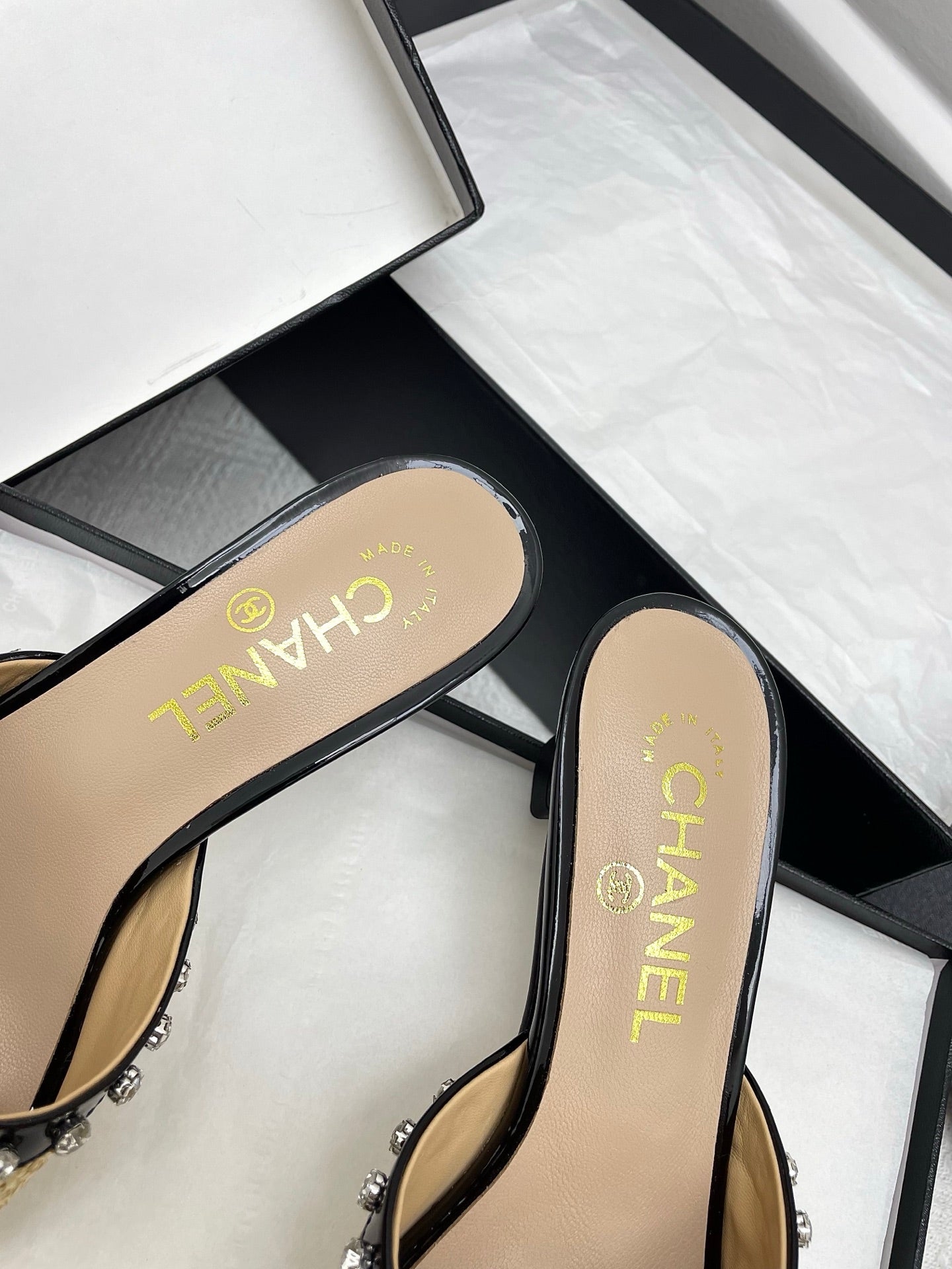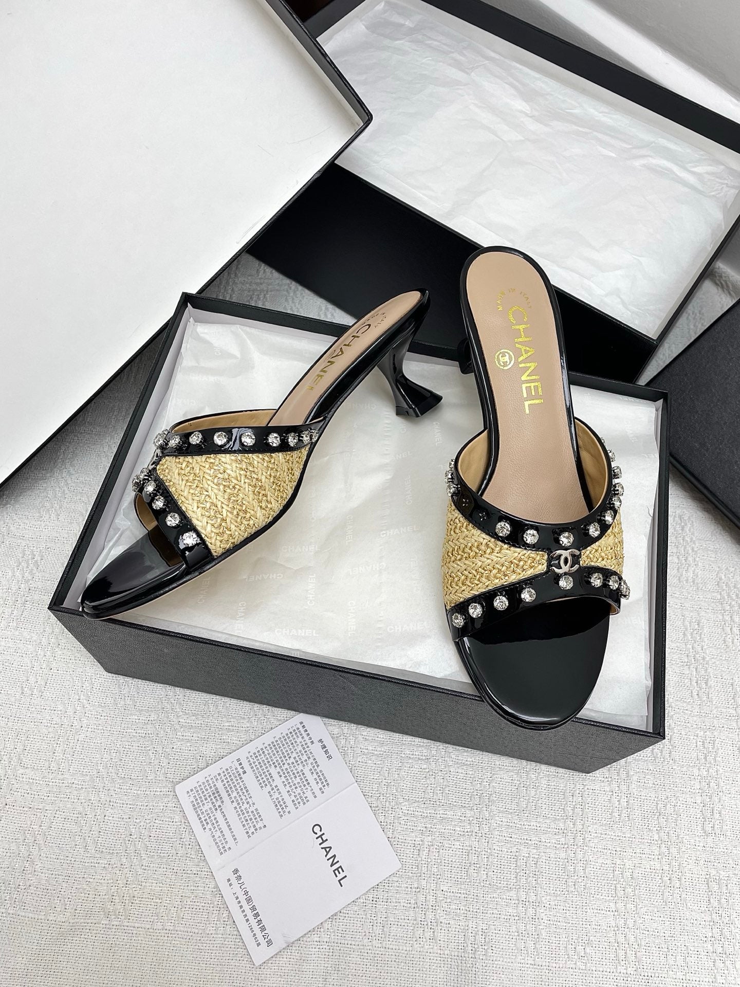 CC 25SS Slippers 5cm Yellow Raffia Black Patent Calfskin 338300