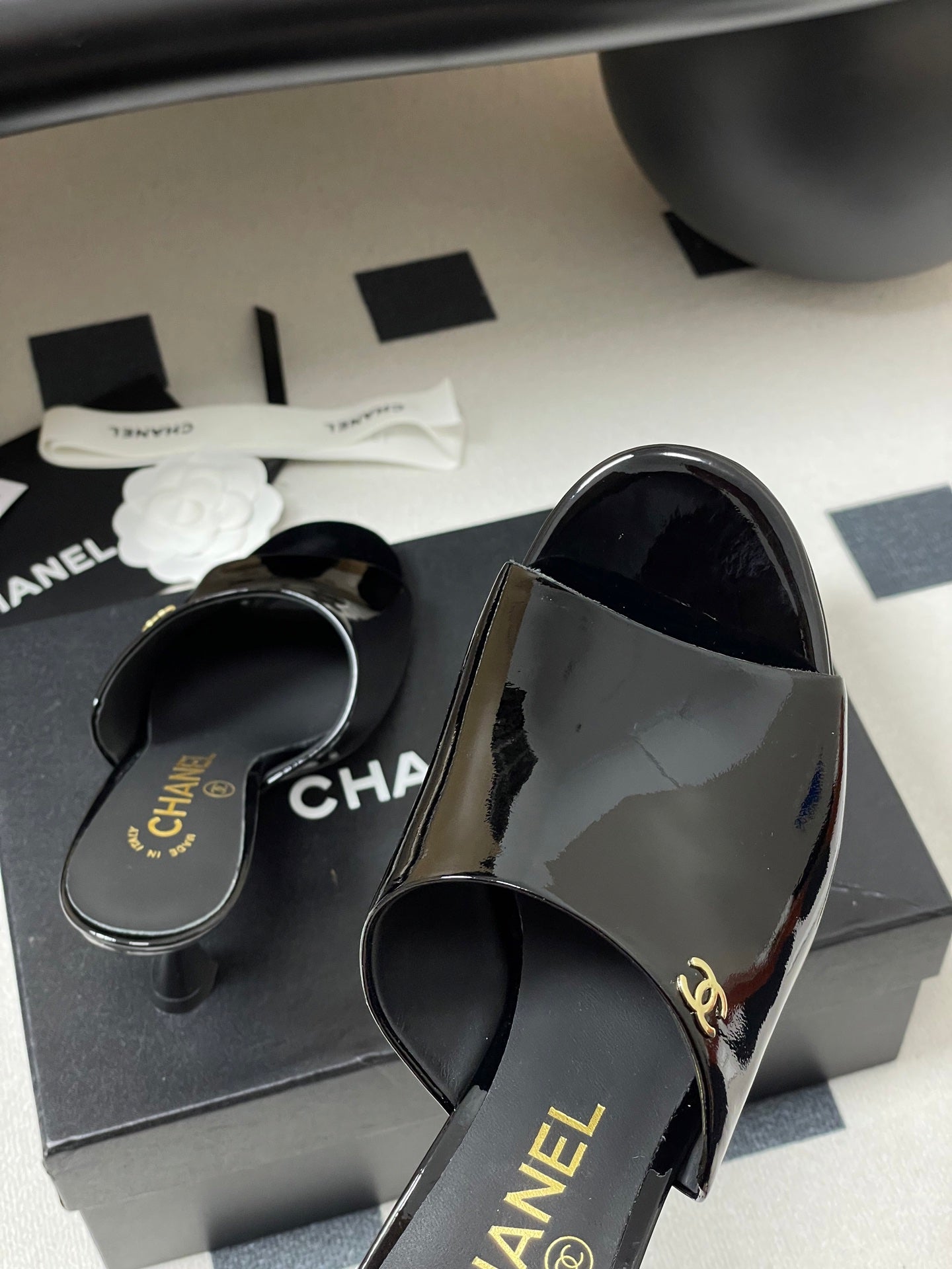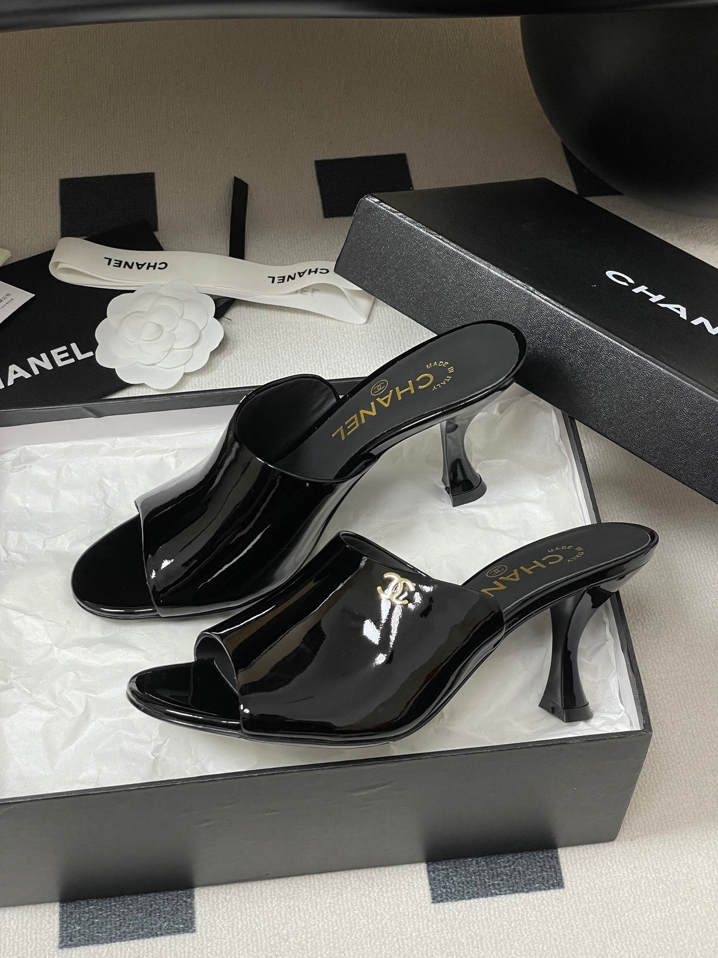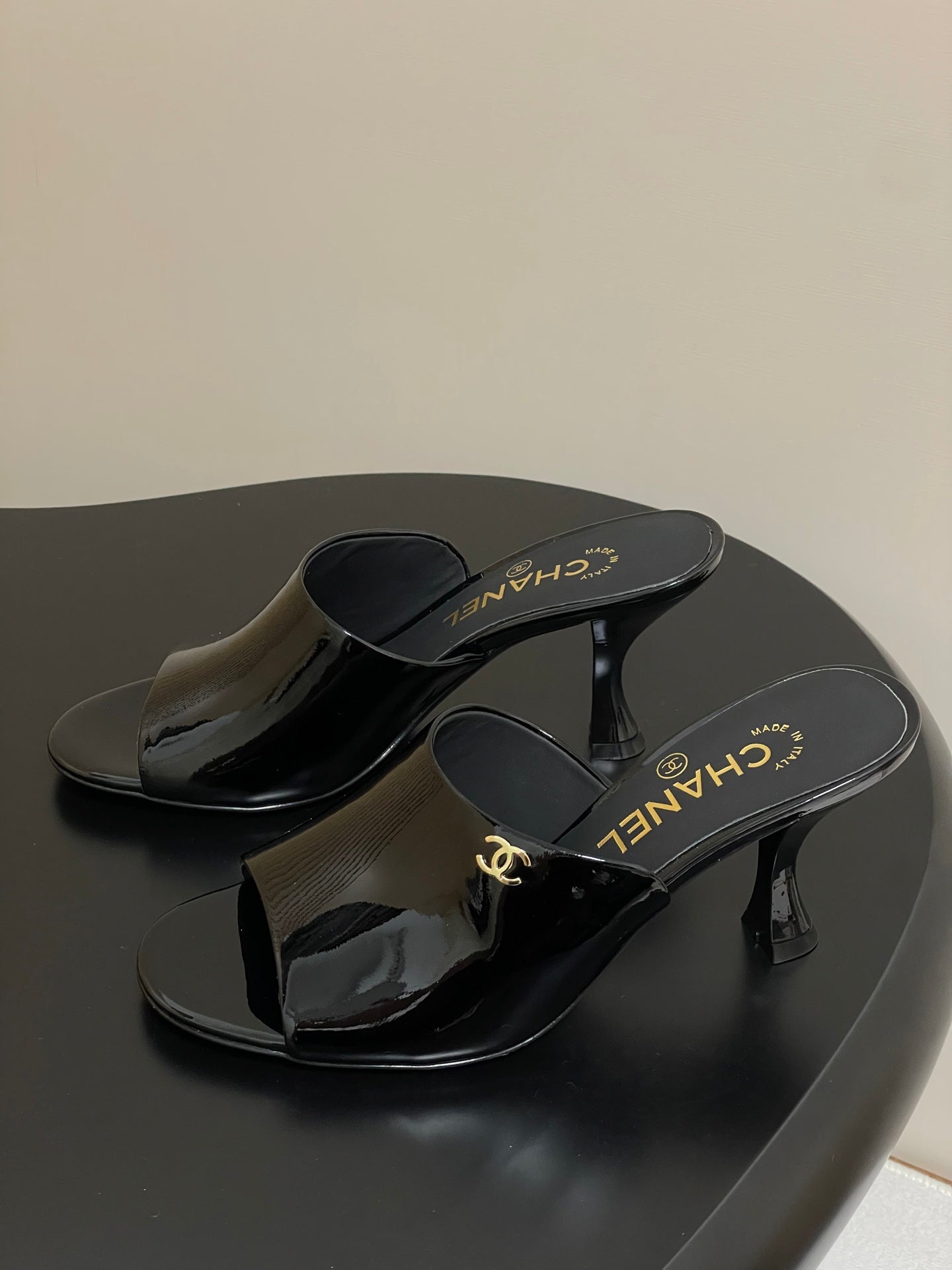 CC 26 Fish Mouth Honey High Heel Slippers 85mm Black Patent Leather 319760