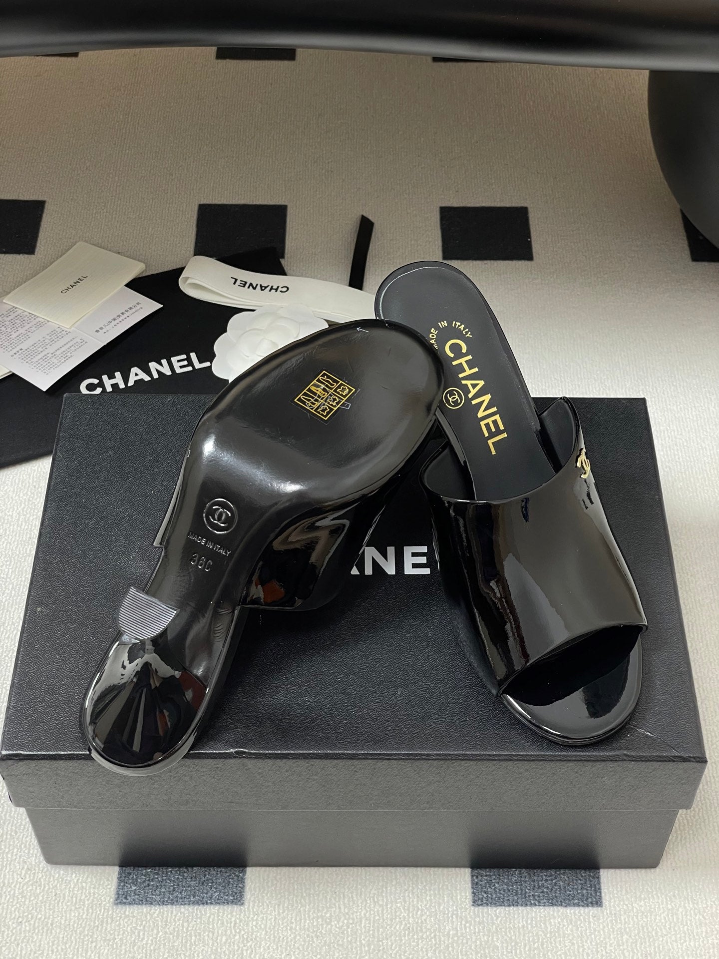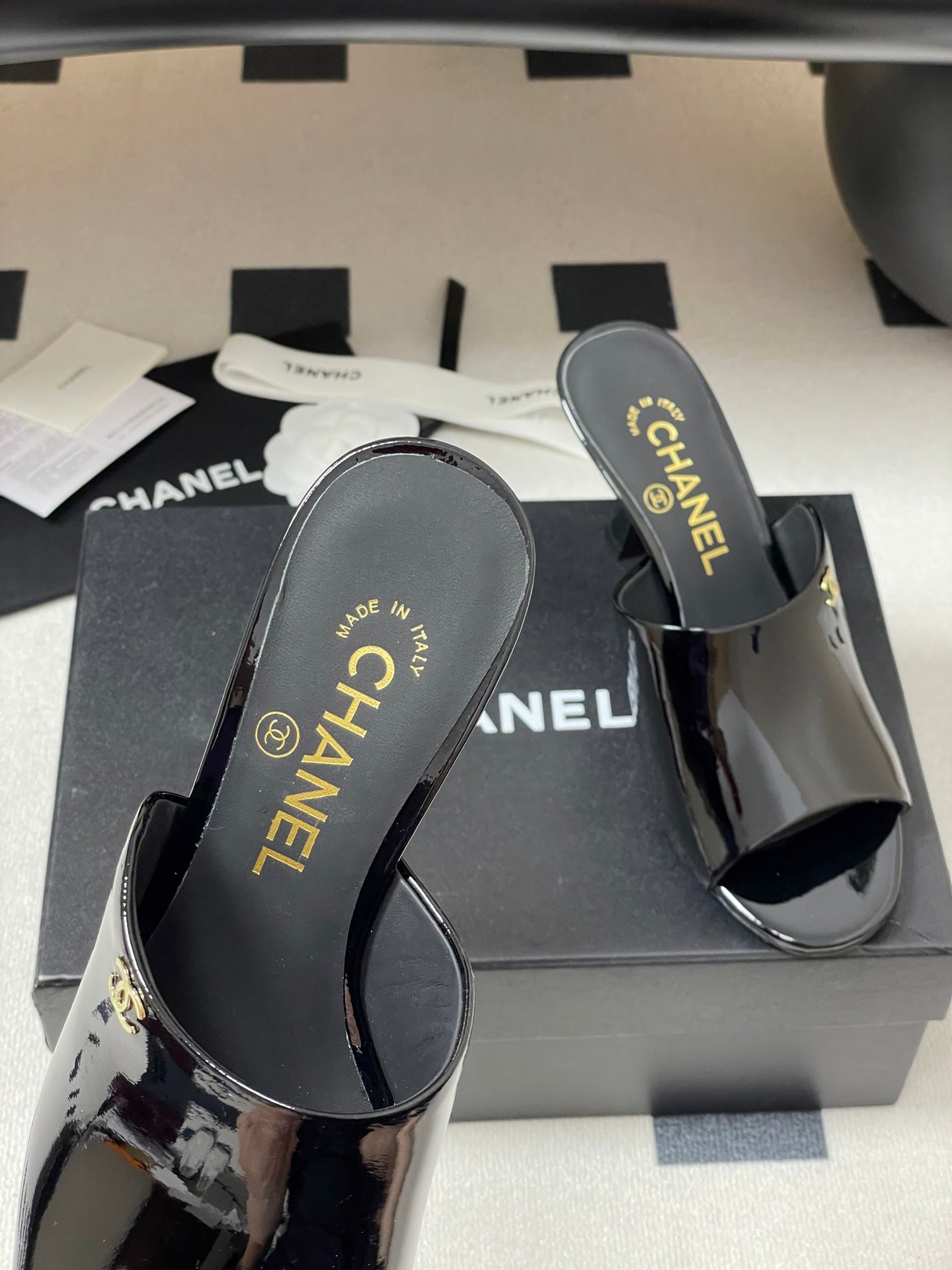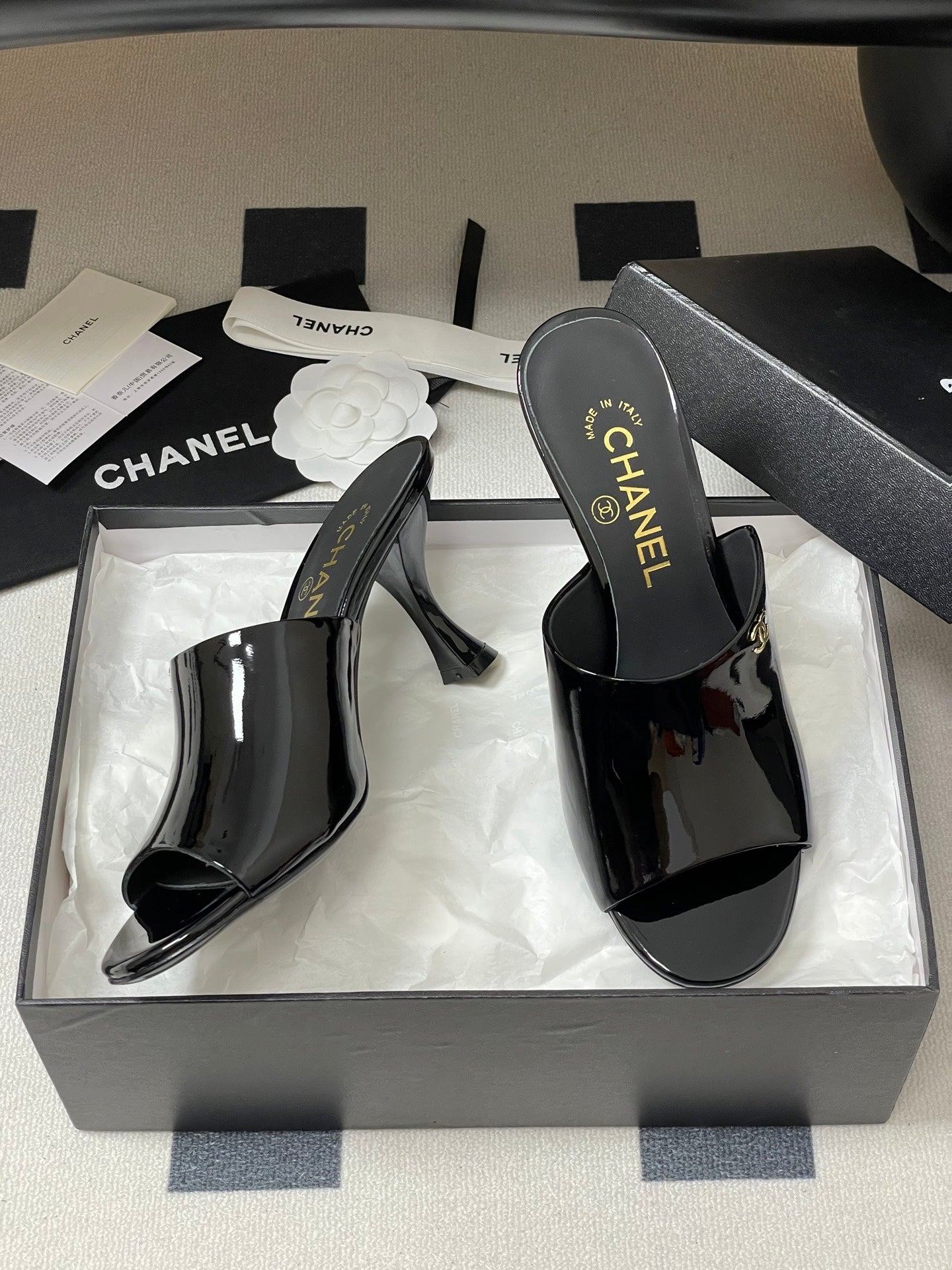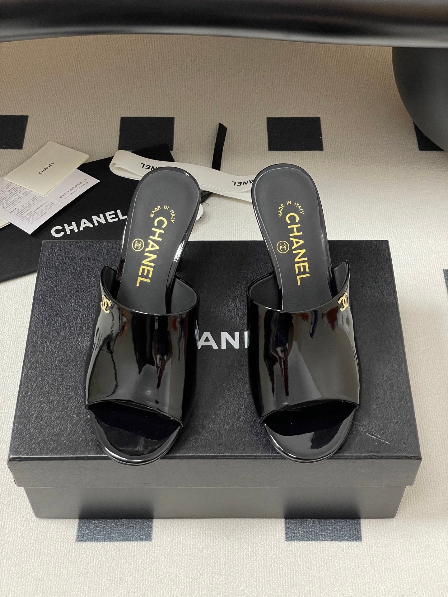 CC 26 Fish Mouth Honey High Heel Slippers 85mm Black Patent Leather 319760