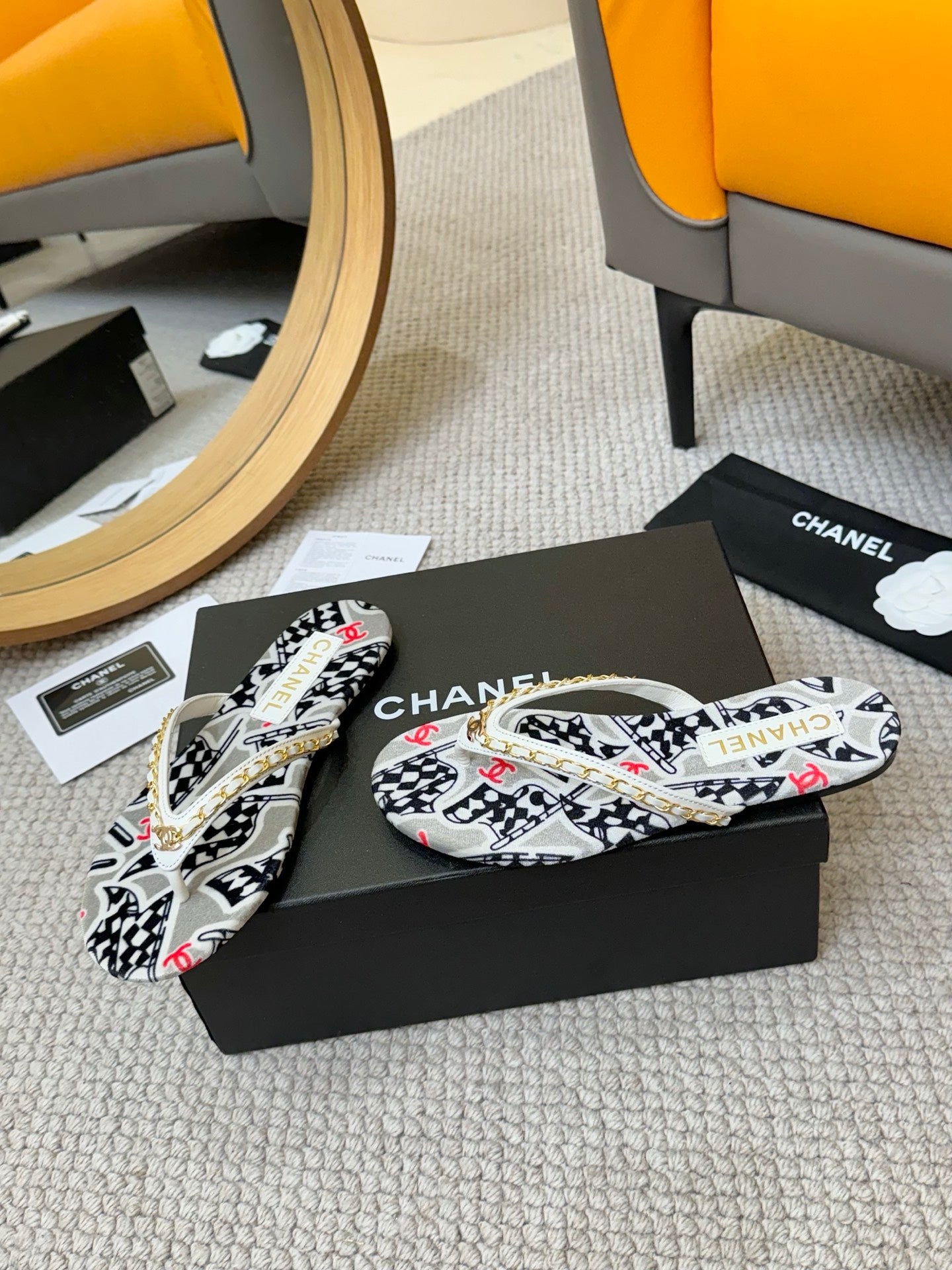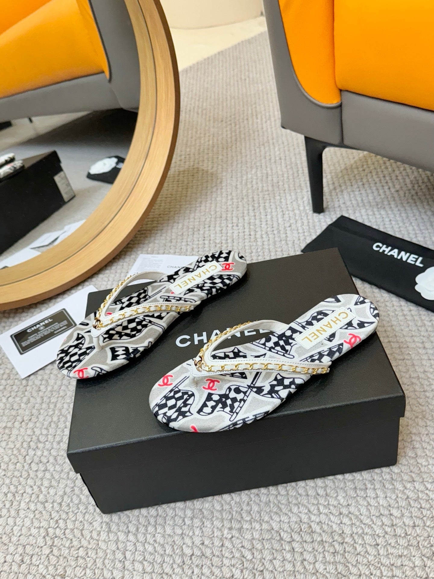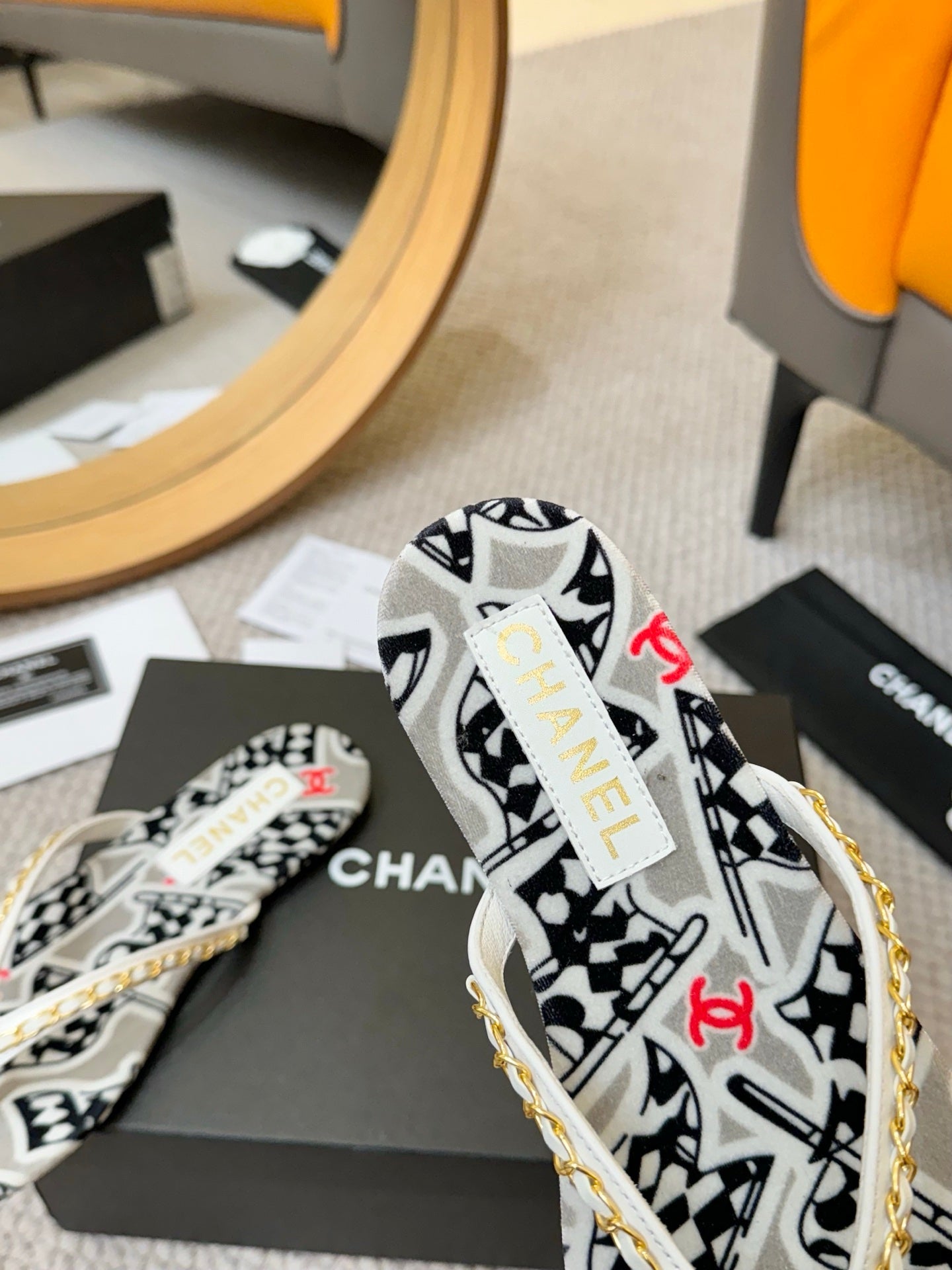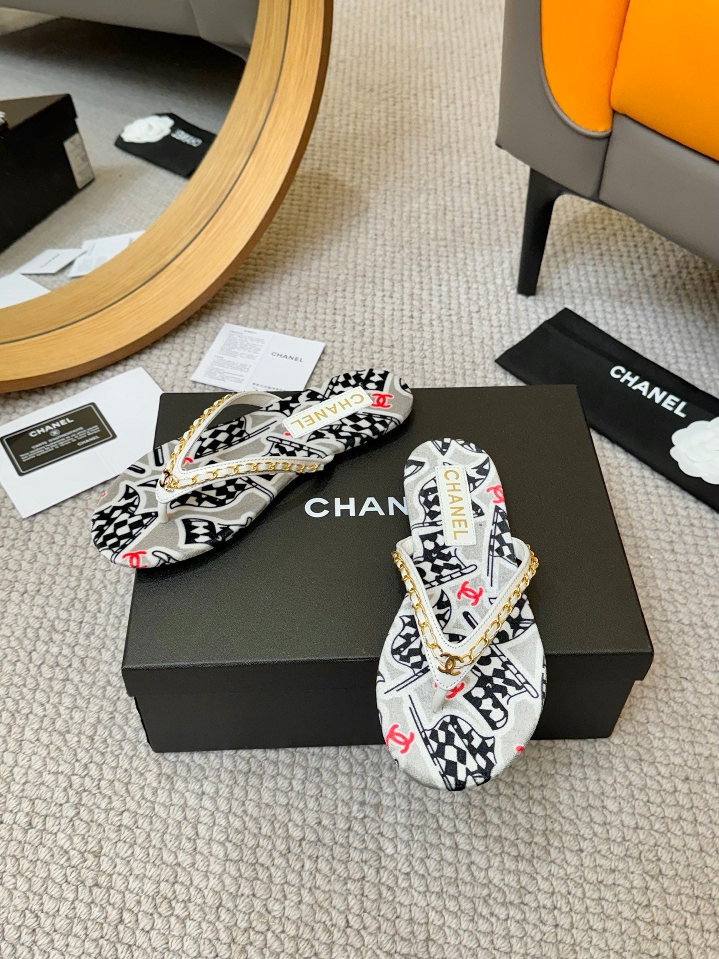 CC Chain Strap Thong Slippers Multicolor Cloth Sheepskin Velvet 305867