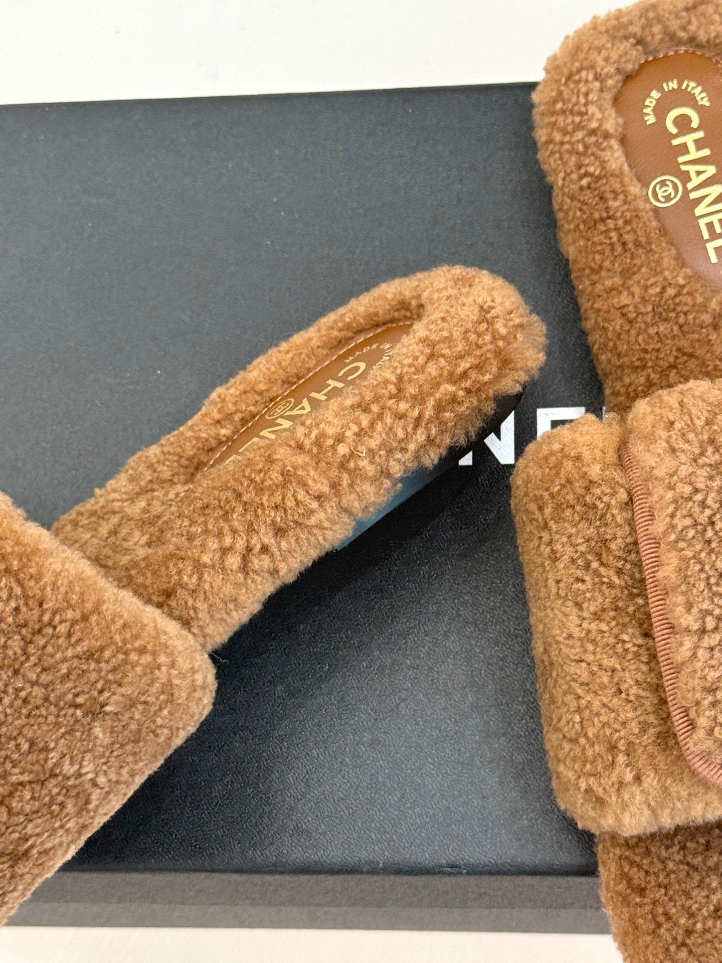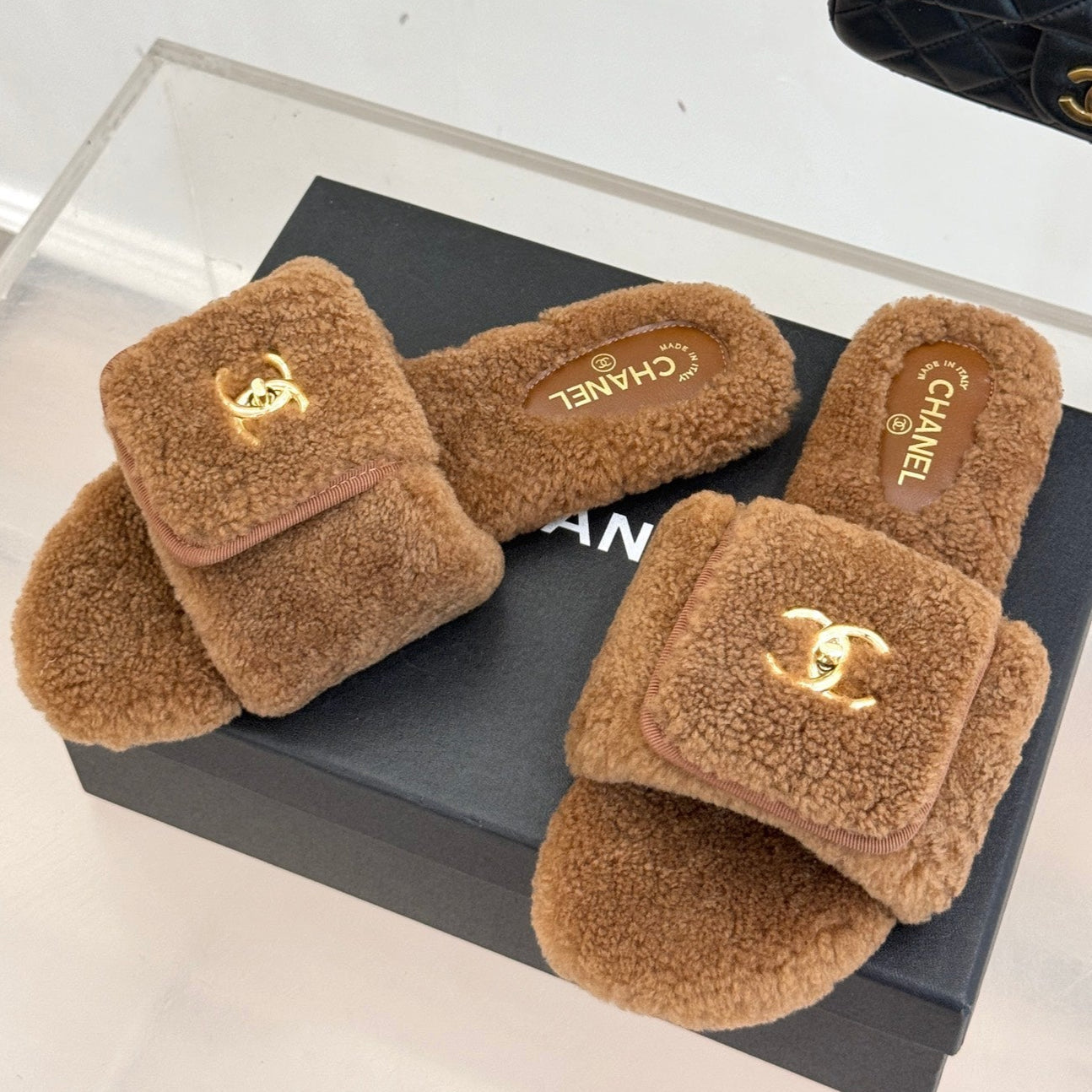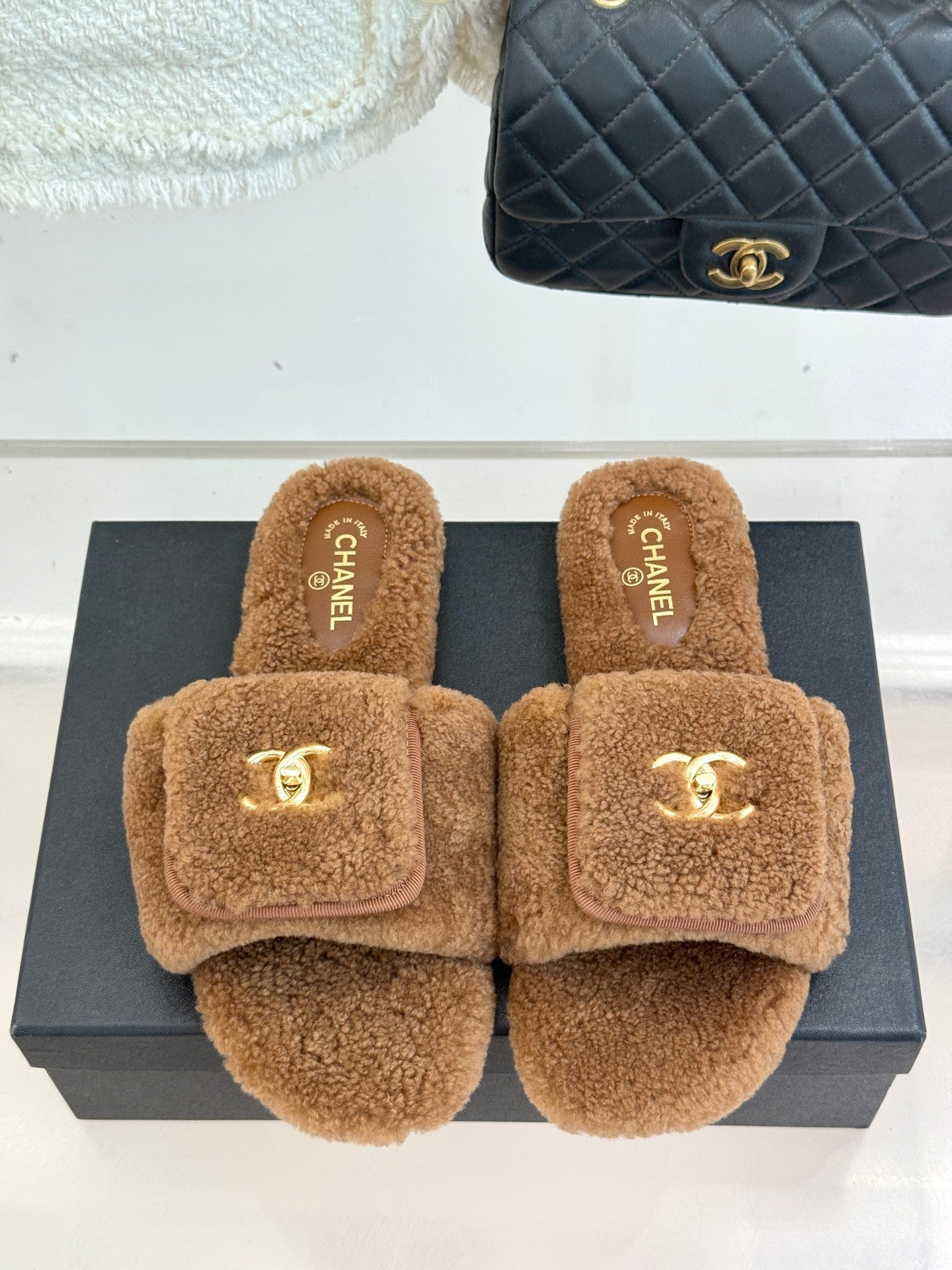 Chanel 25 Buckle Flip-up Thick-soled Slippers Brown Wool 465381