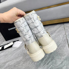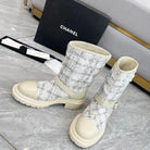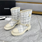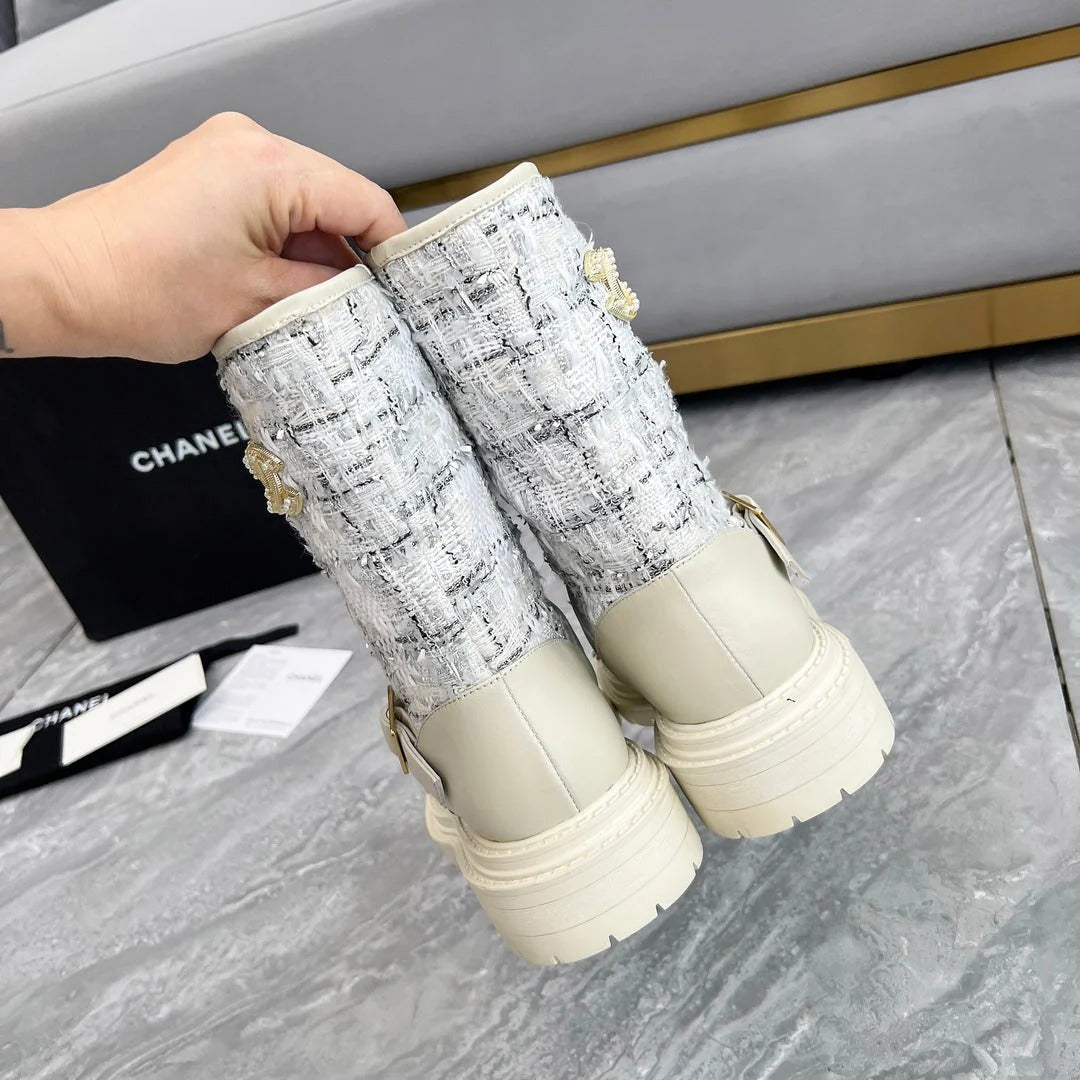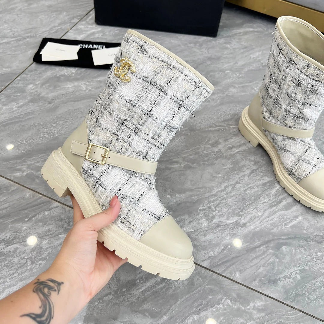 CHANEL 25S MID-CALF BOOTS 45MM IN BEIGE CALFSKIN AND WHITE TWEED GOLD HARDWRE
