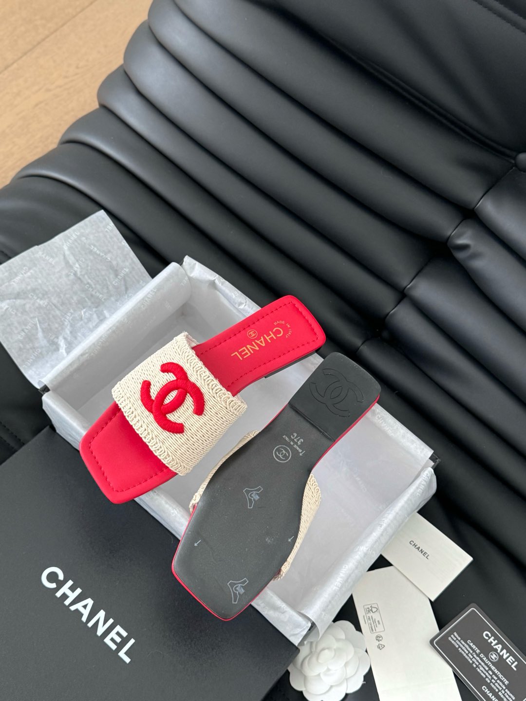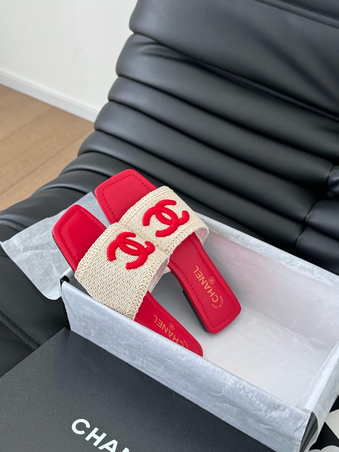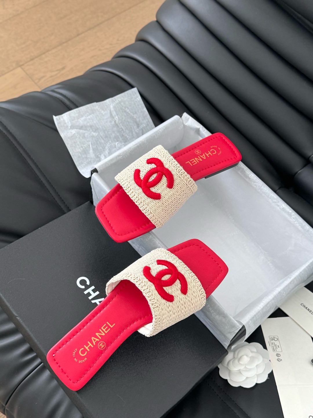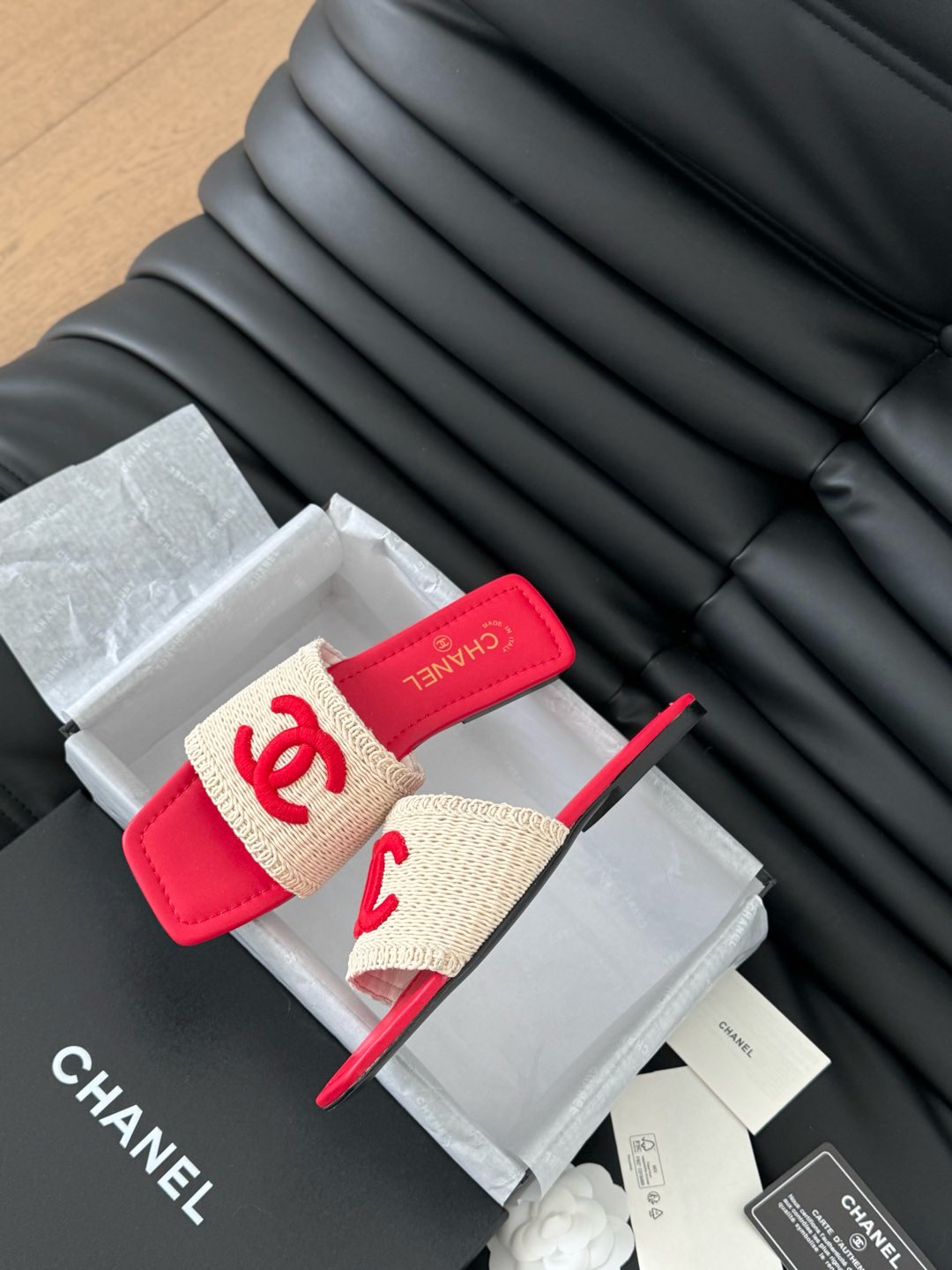 WOVEN SLIDE IN RAFFIA AND RUBY RED LAMBSKIN
