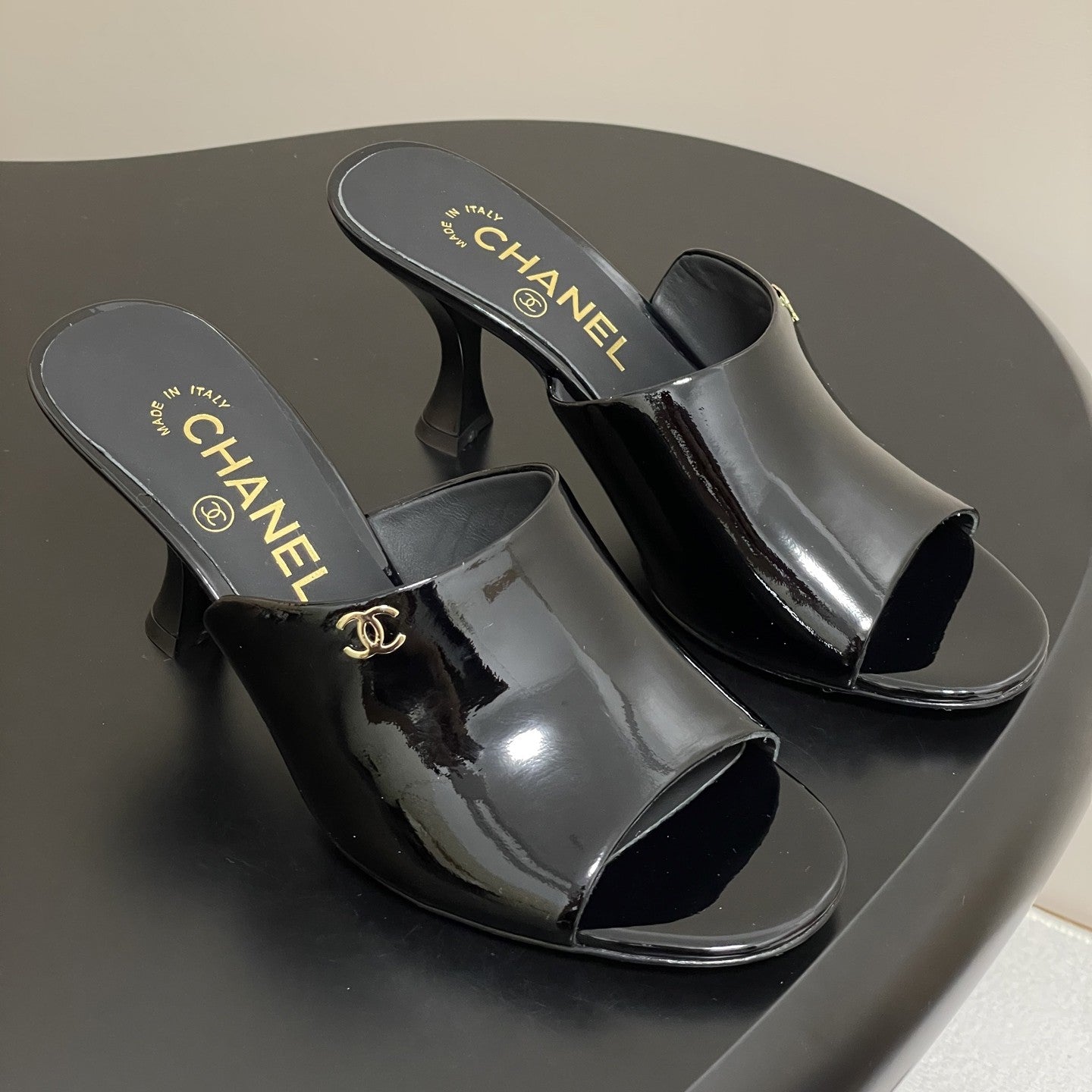 CC 26 Fish Mouth Honey High Heel Slippers 85mm Black Patent Leather 319760