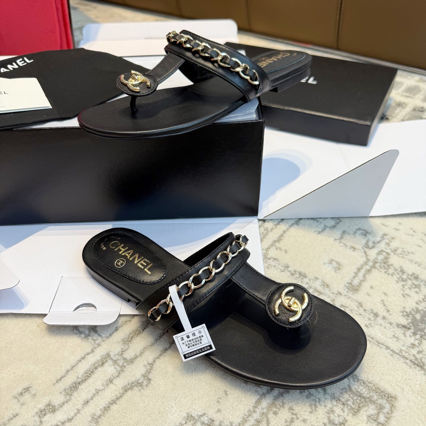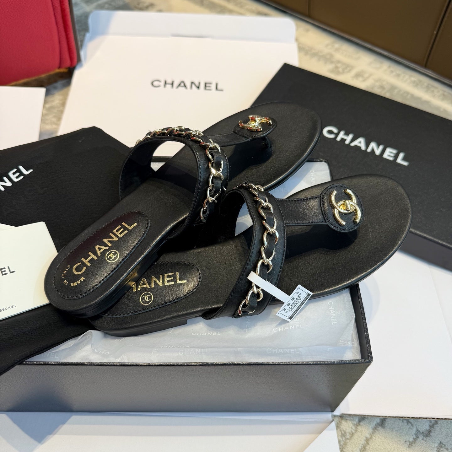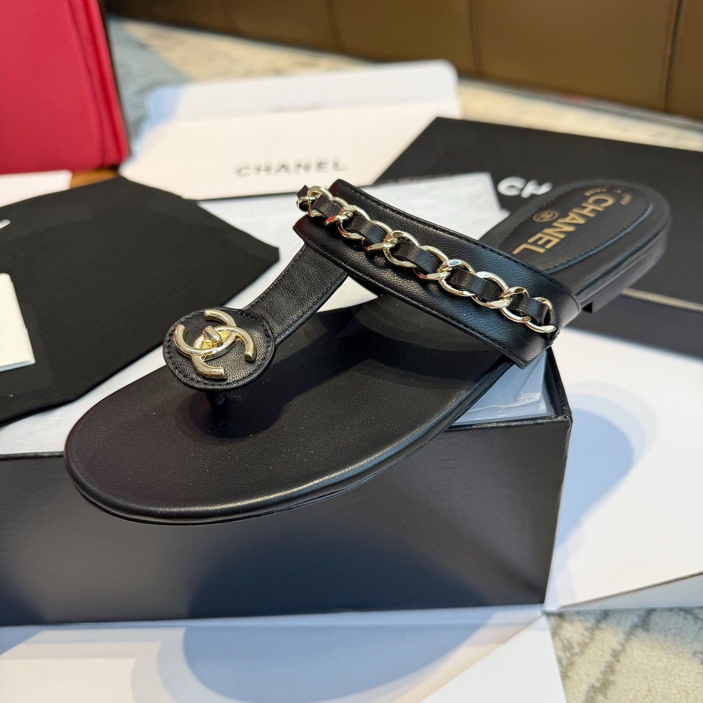 CC 25SS Thong Sandal 2cm Leather Chain Black Lambskin 319700