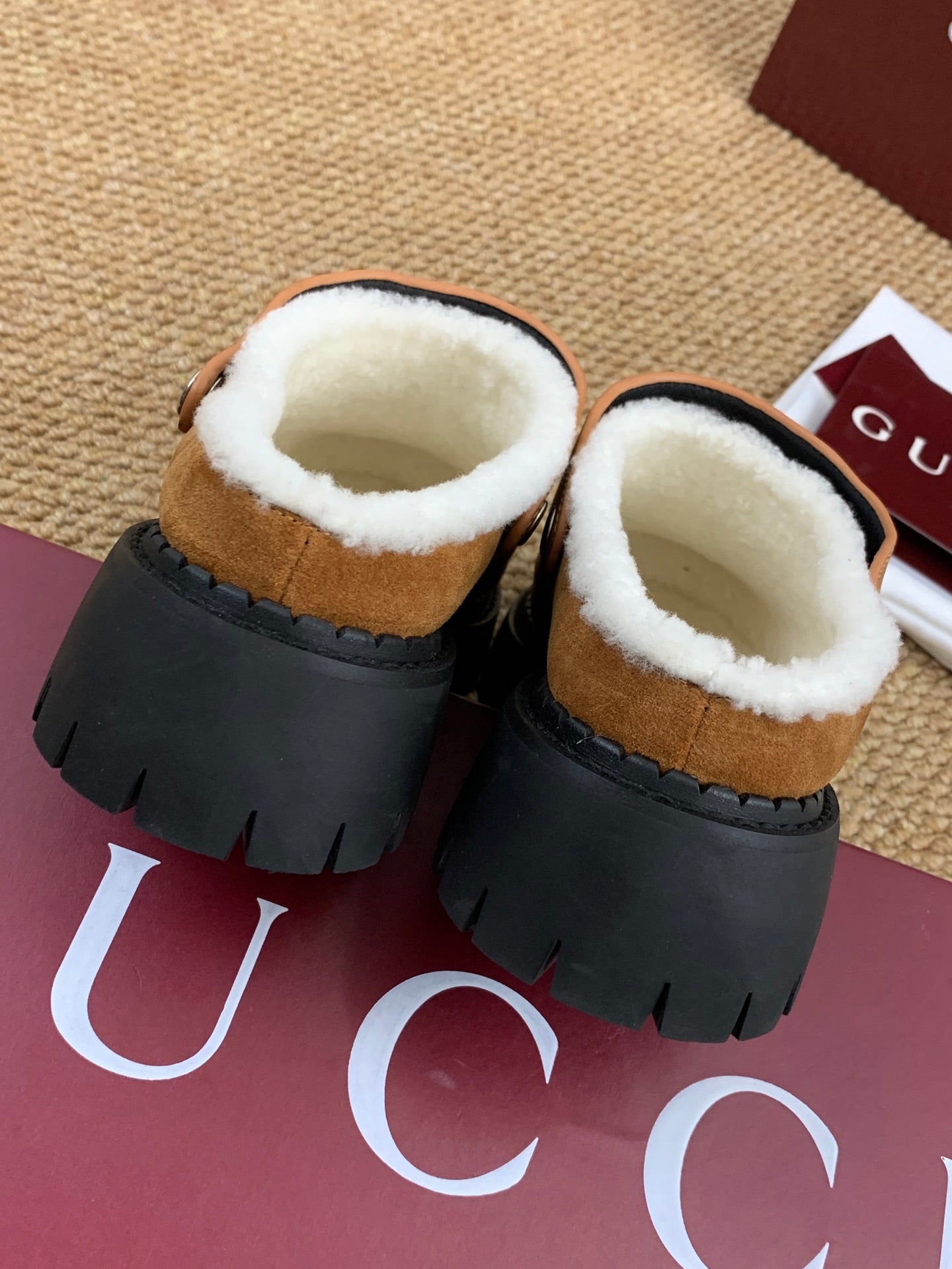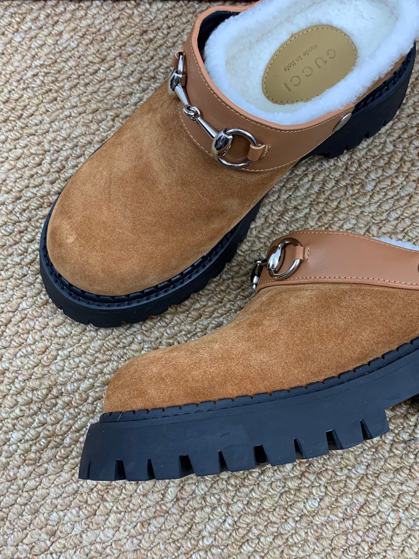 Gucci FW 25 Horsebit Suede Clog Camel Suede with Shearling 506444