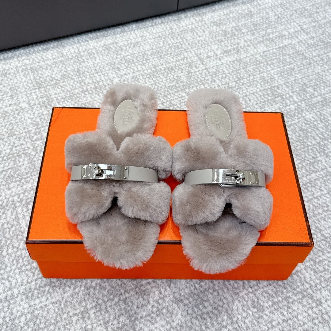HM 25s H Shaped Slipper with Buckle Gray Shearling 462197