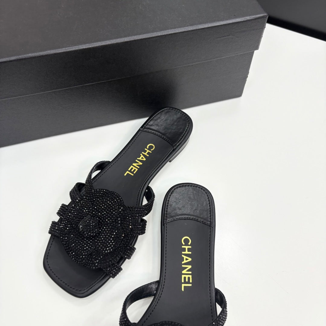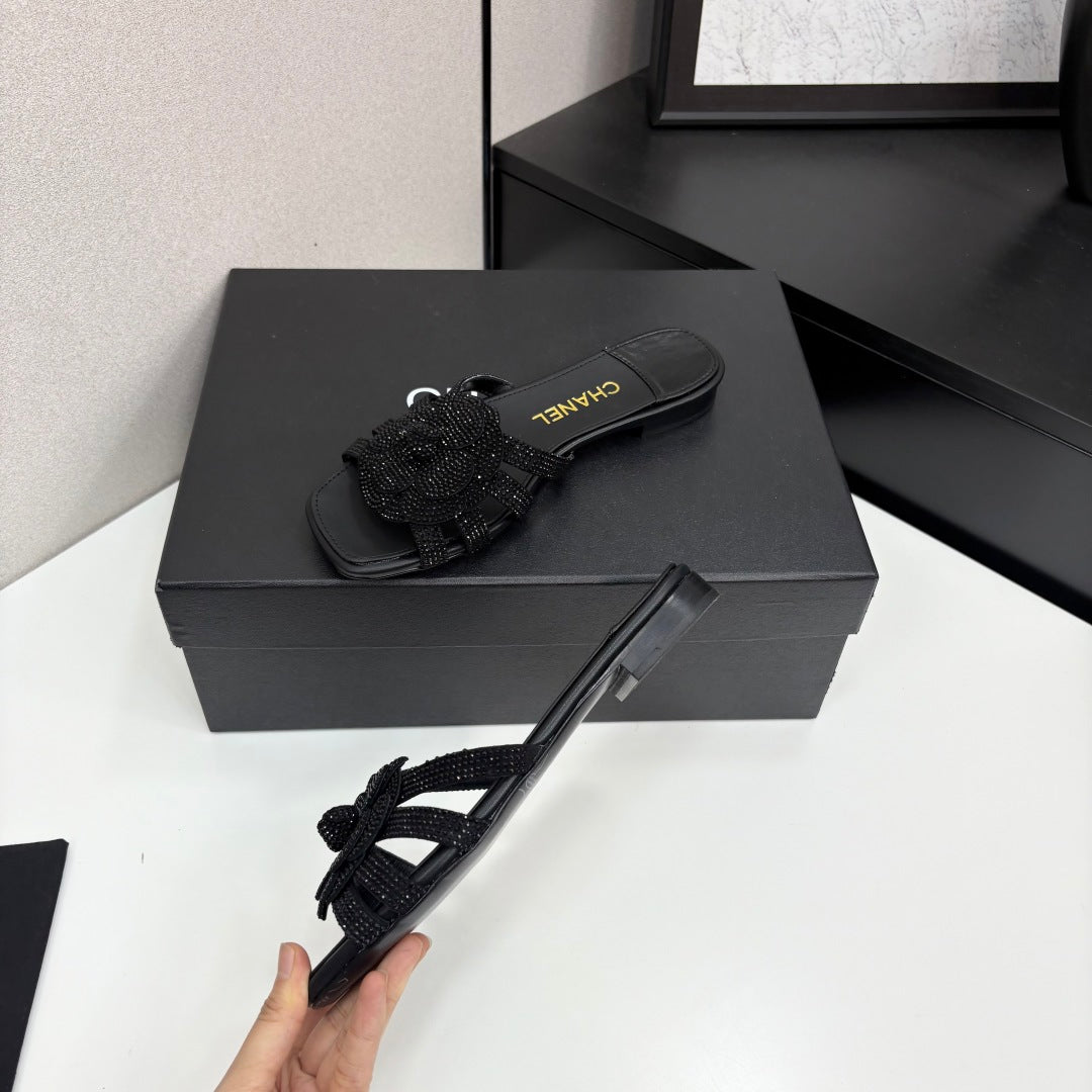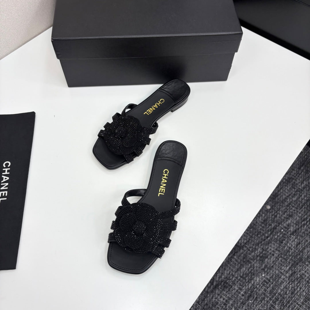 CC 25 Camellia Open Flat Mule Black Stone Grain And Sheepskin 368851
