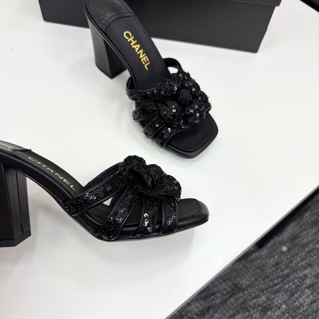 CC 25 Camellia Open Heel Mule Sandals 90mm Black Coarse Glitter Fabric And Sheepskin 368846