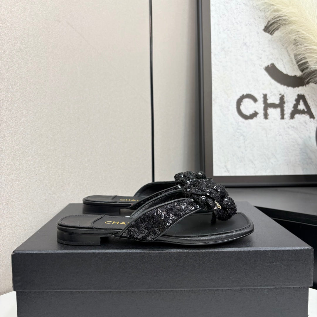 CC 25 Camellia Thong Sandals Black Coarse Glitter Fabric And Sheepskin 368835