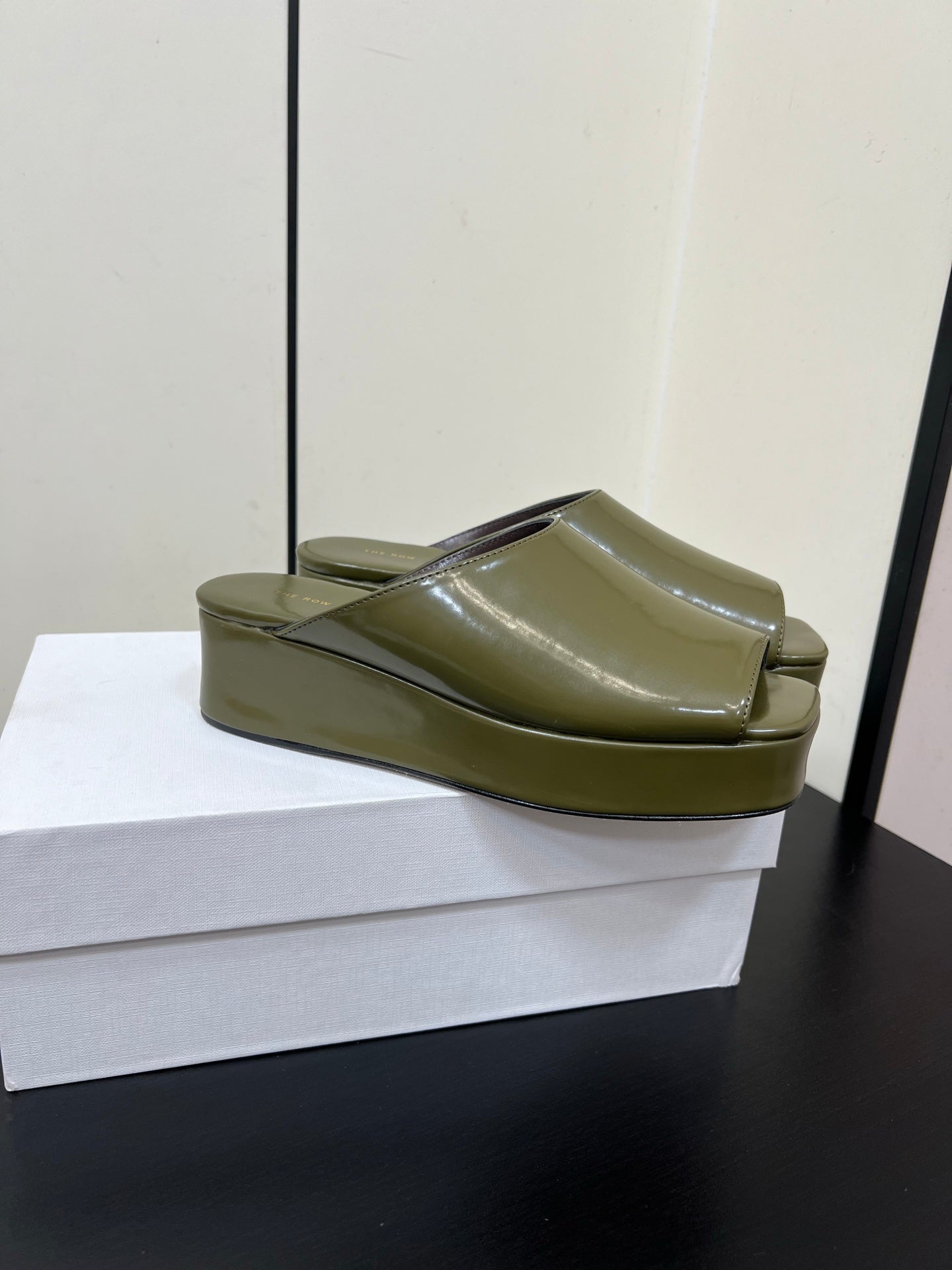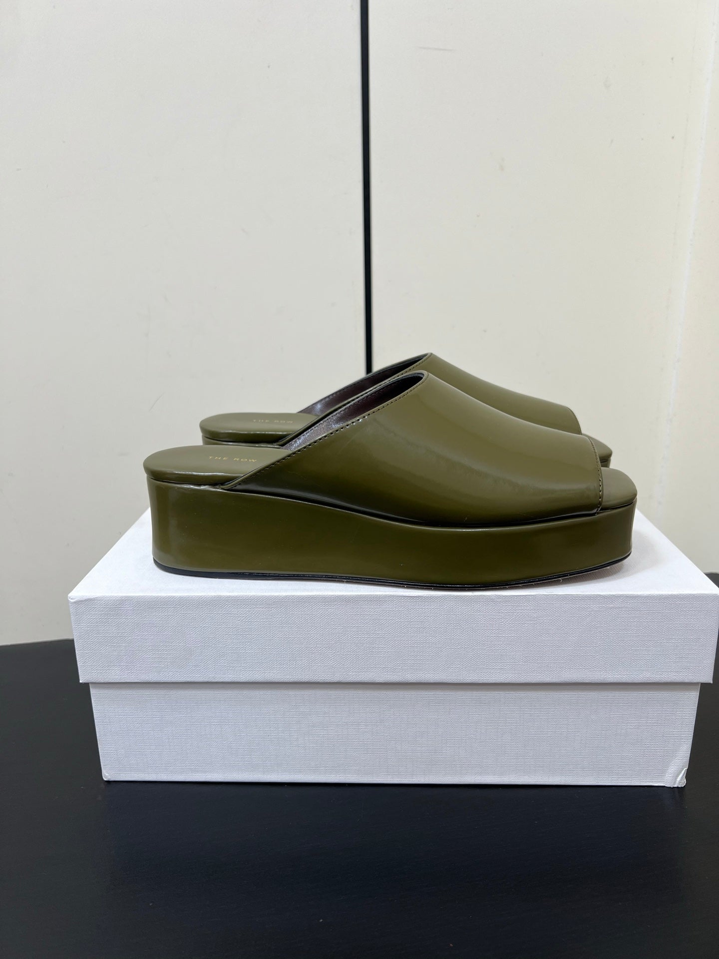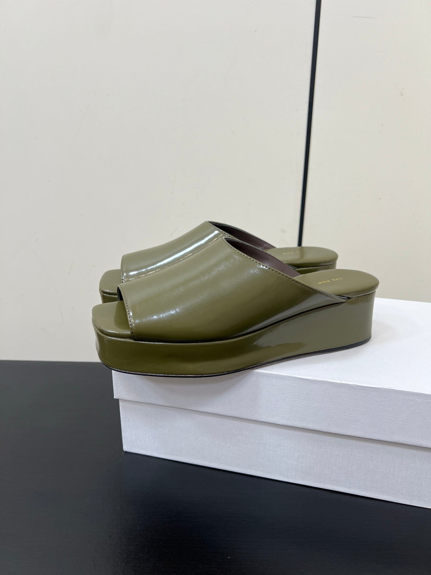 The Row Emi Flatform Sandal 50mm Olive Patent Leather 340004