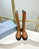 KNEE BOOTS WITH TRIANGLE LOGO IN CAMEL CALFSKIN