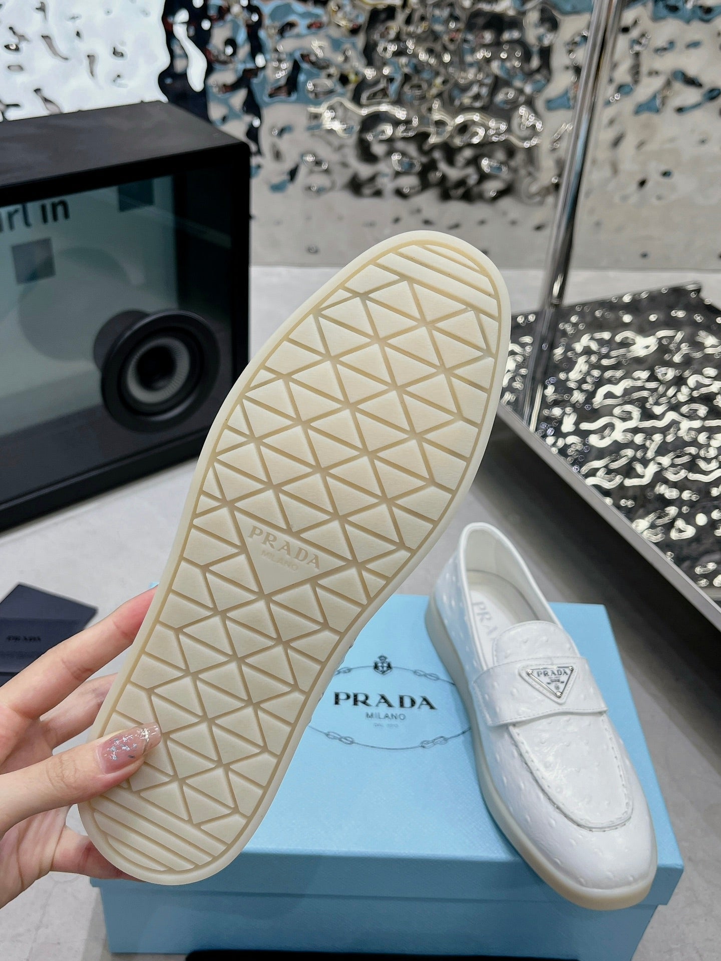 PRA OSTRICH PATTERN LOAFERS CREAMY WHITE CALFSKIN