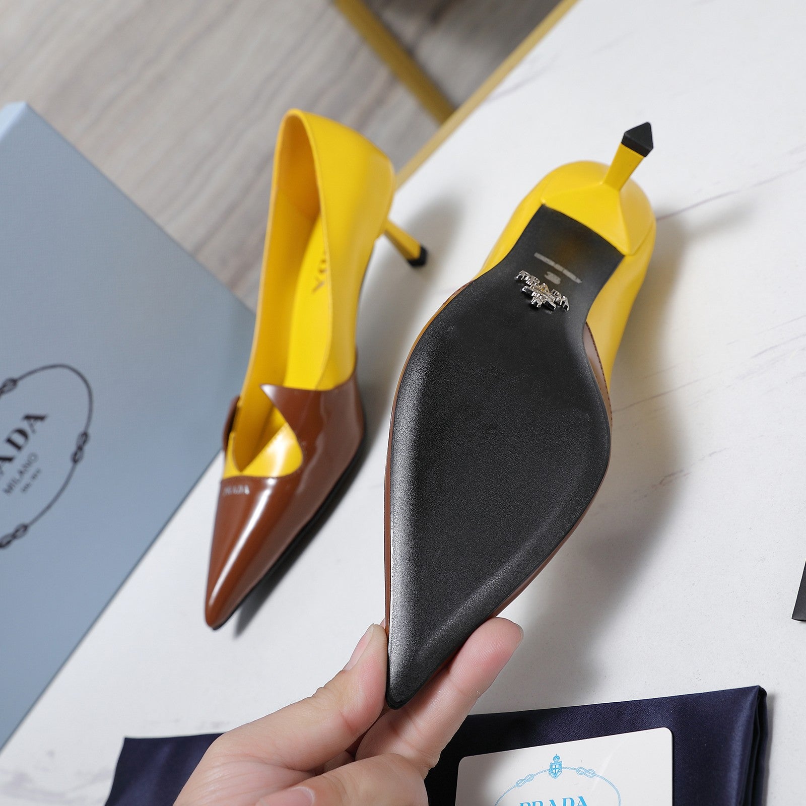 Prada Two-Tone Brushed Pumps 55mm Chocolate Yellow Cowhide 456264