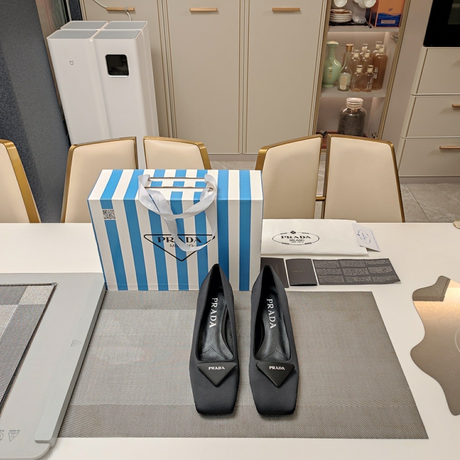 TRIANGLE LOGO PUMPS IN BLACK SATIN