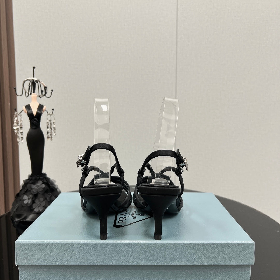 PRA TRIANGLE HEEL FLOWER MOTIF SATIN SANDALS BLACK