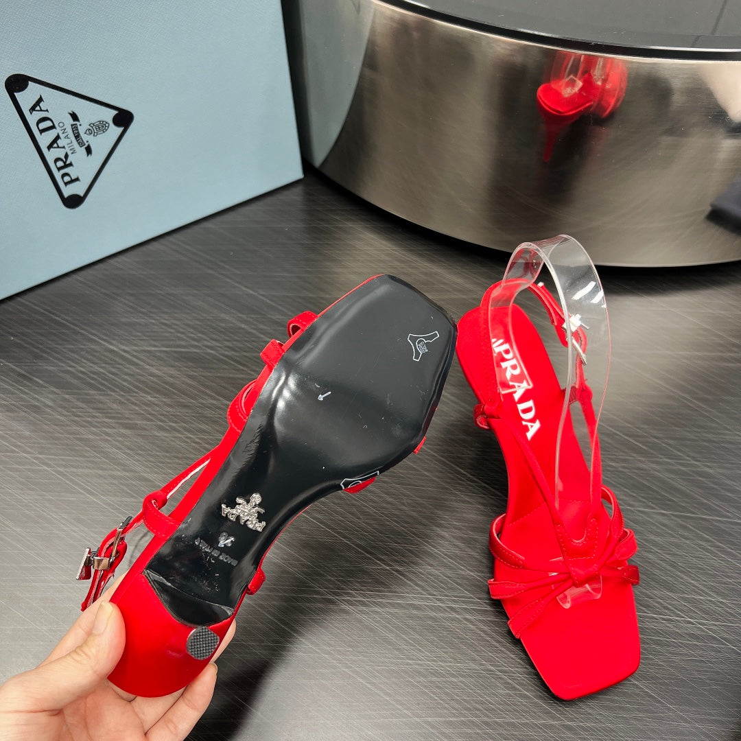 PRA TRIANGLE HEEL FLOWER MOTIF SATIN SANDALS RED