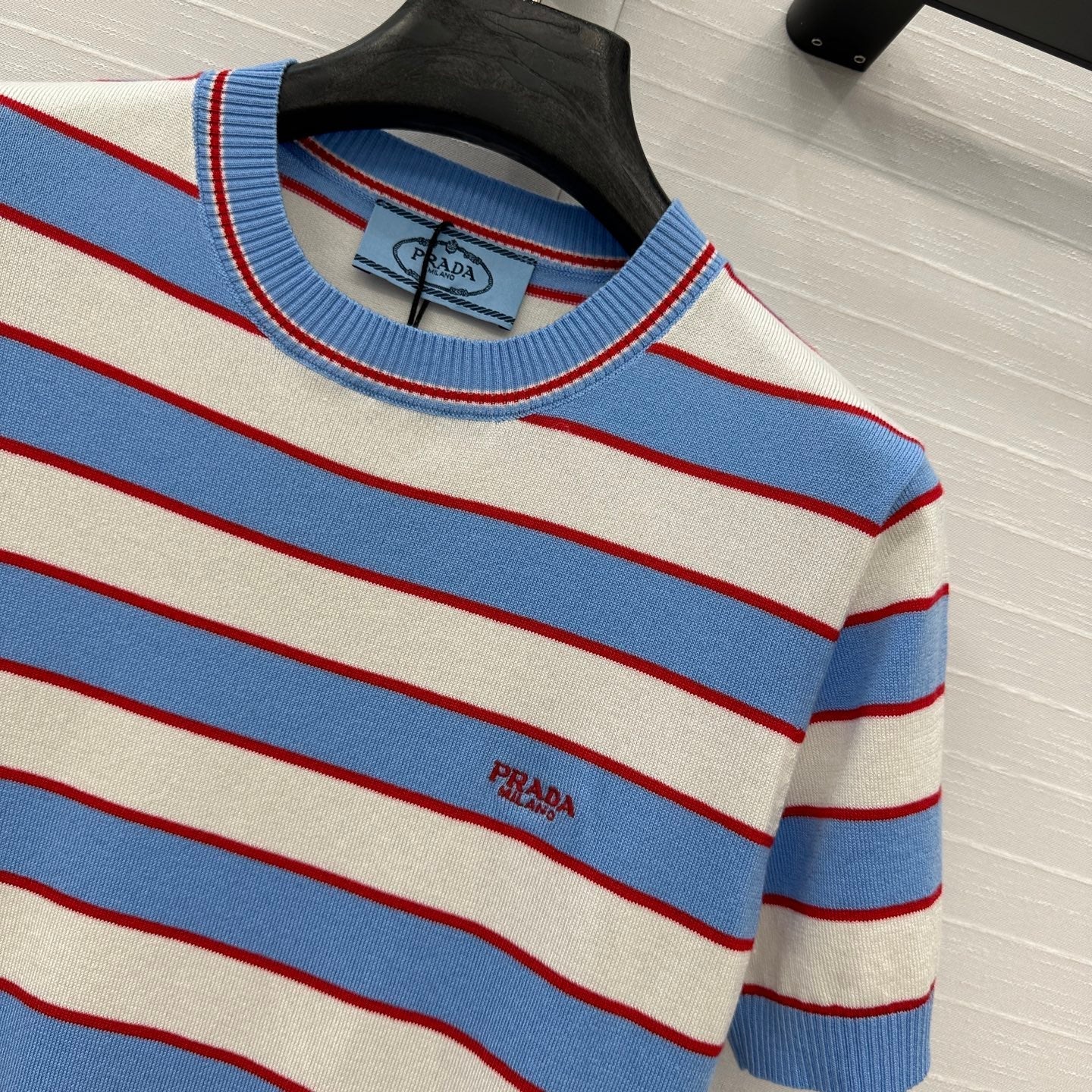 Prada 25 Striped Short-sleeved Knitted Top Blue white red Cotton