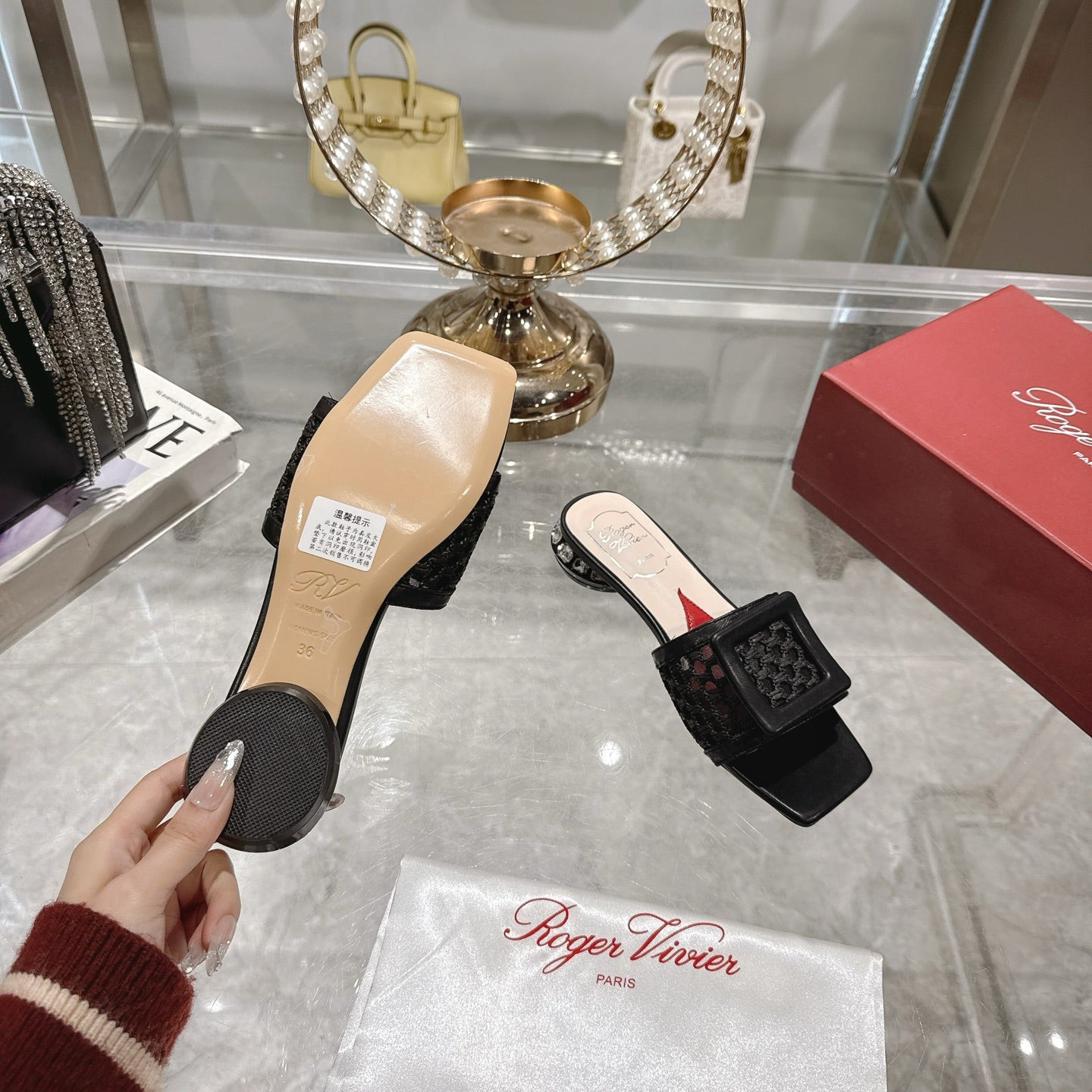 Viv 25 Hollow Square Buckle Slippers Black Weaving Leather 262999