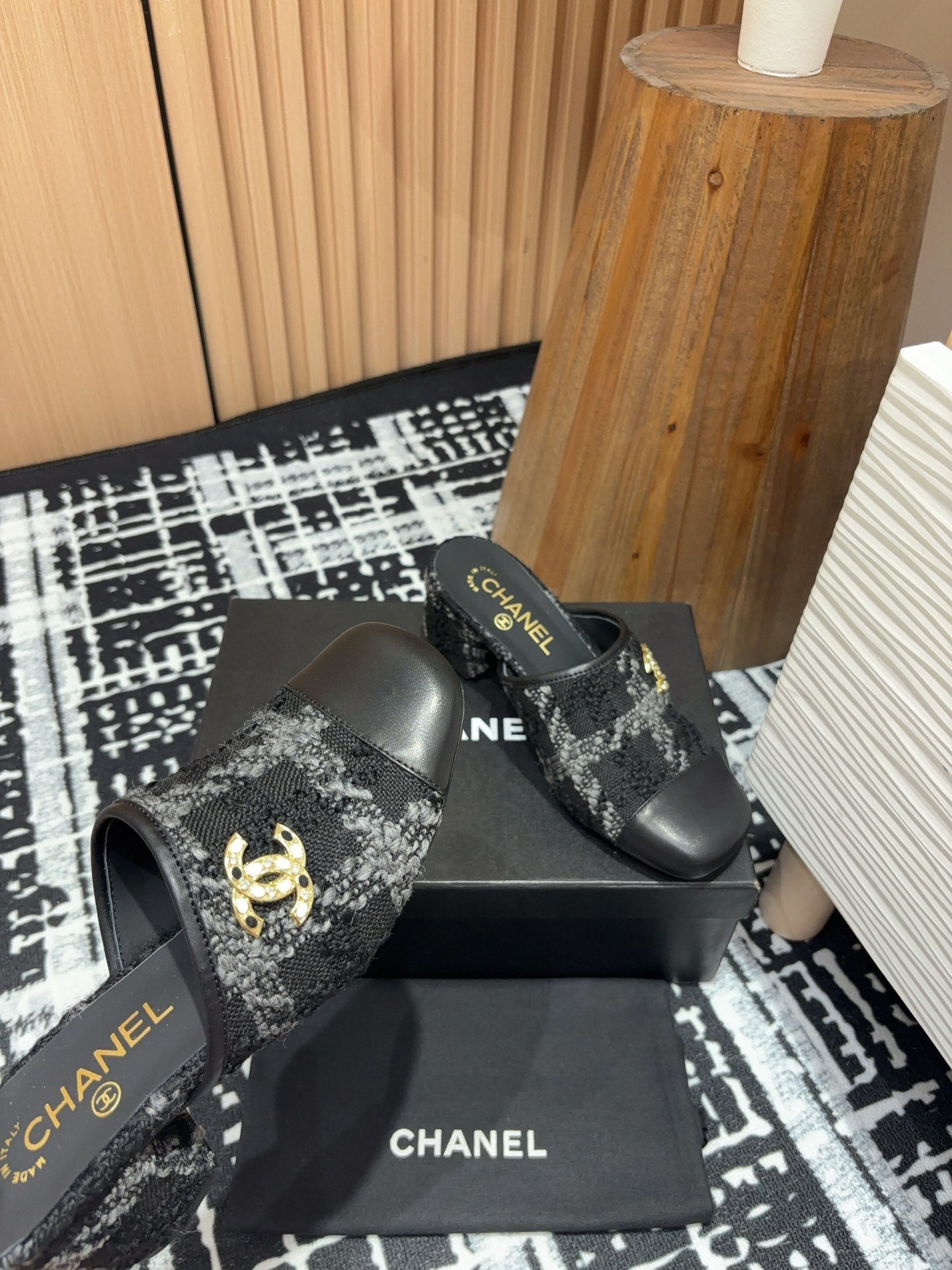 CC Mule 60mm In Black Wool Tweed And Lambskin Gold Hardware