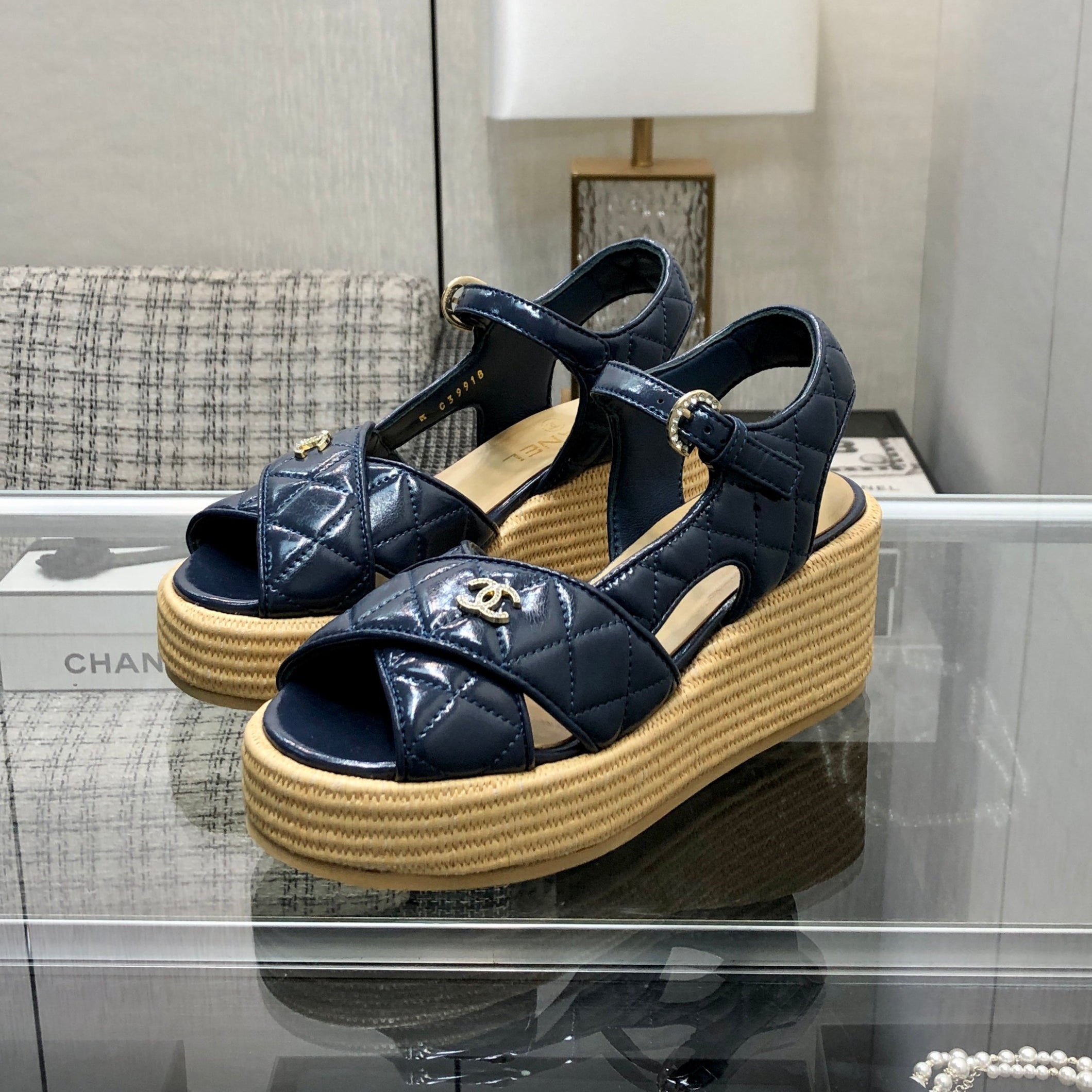 PEEP-TOE THICK SOLE SANDALS IN NAVY BLUE PATENT LAMBSKIN