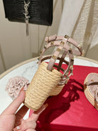 Rockstud Ankle Strap Wedge Sandal In Crepe Pink Calfskin Leather And Beige Raffia 100mm 829391