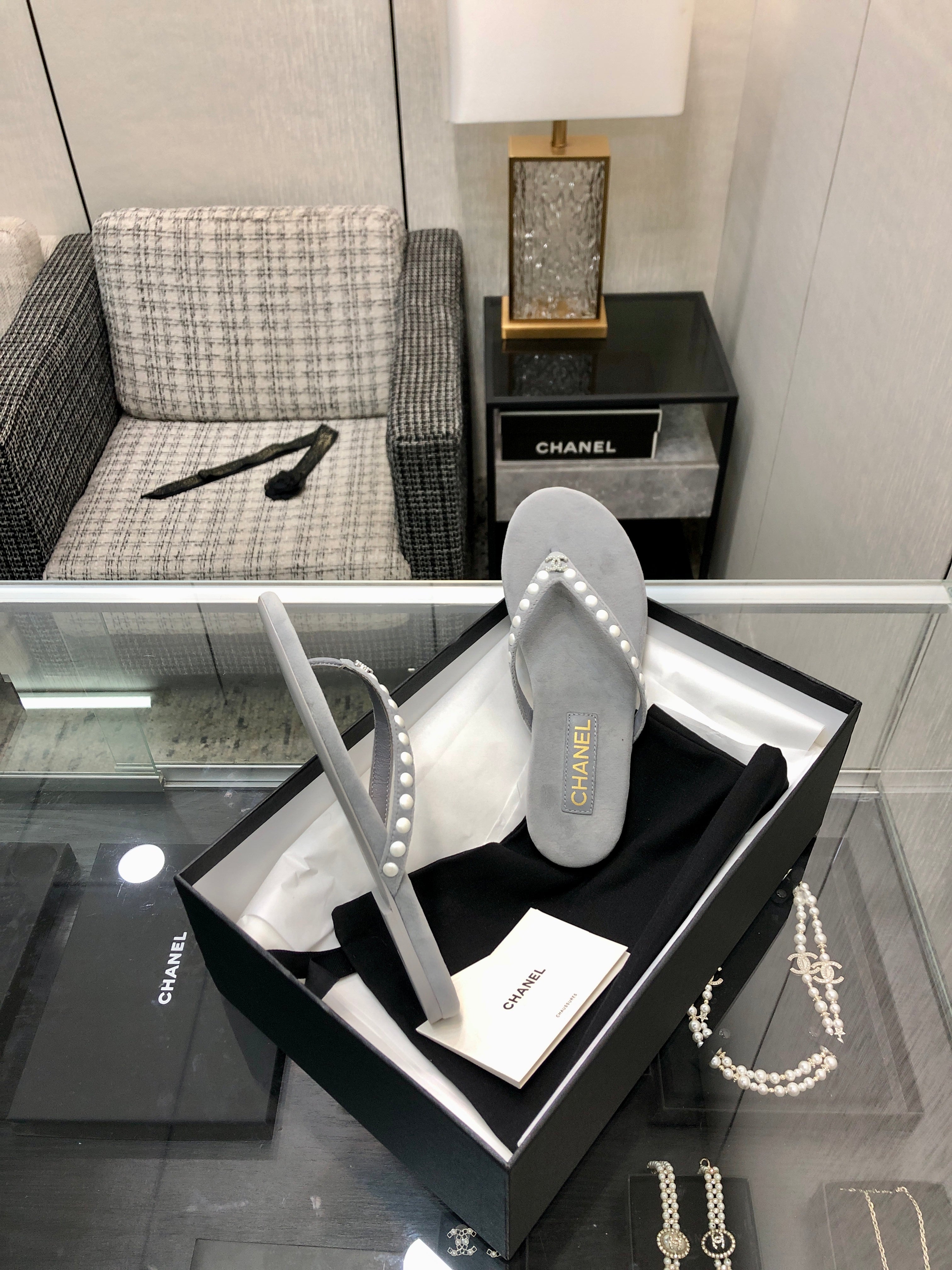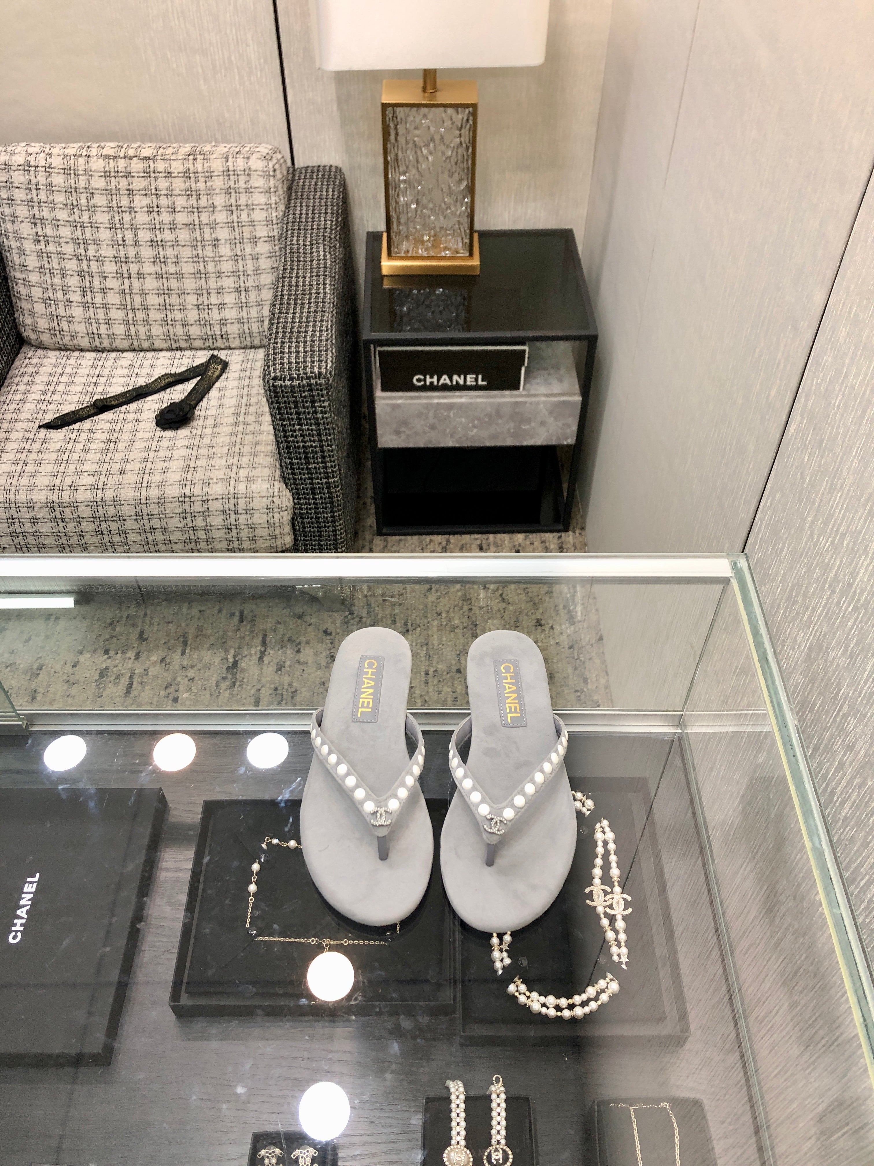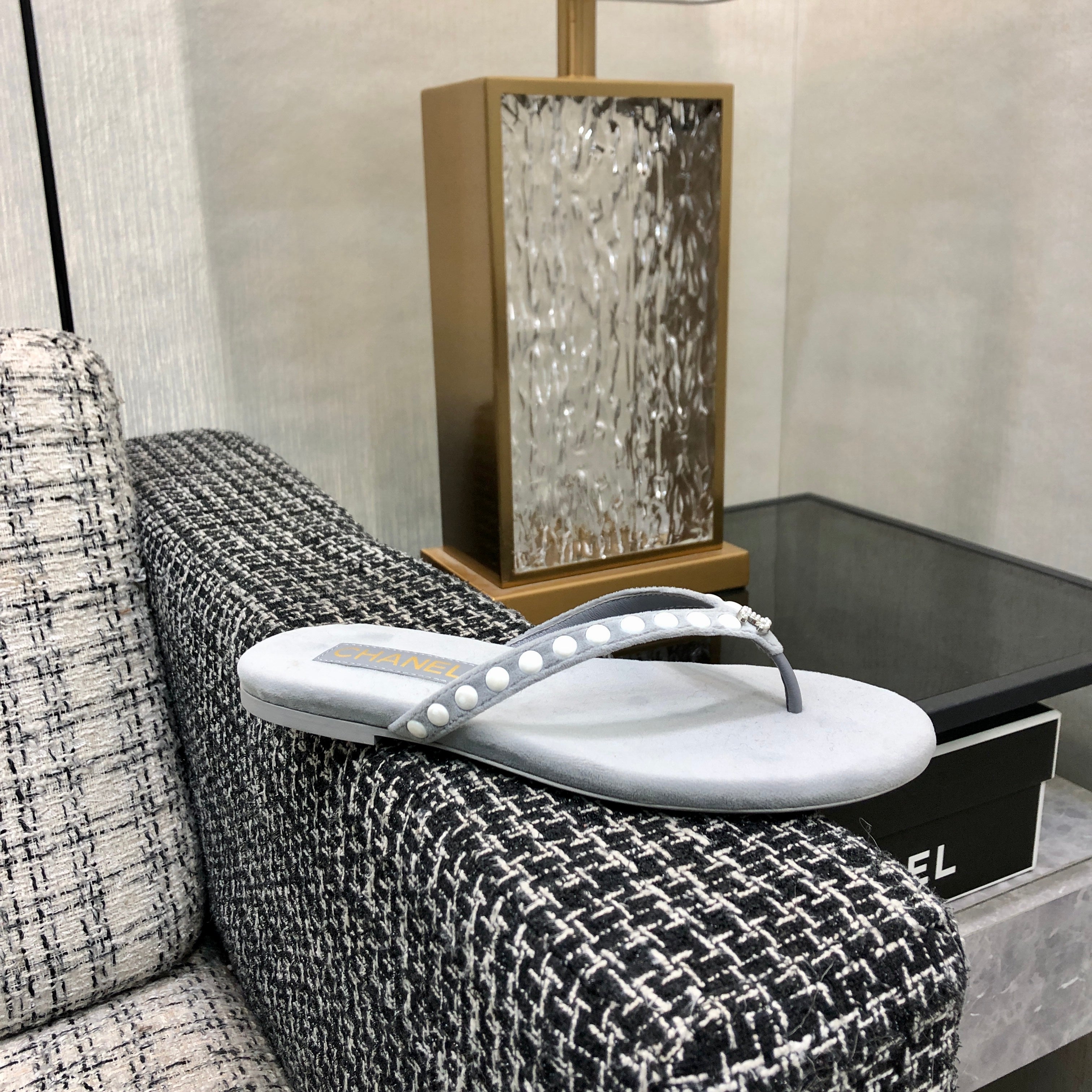 THONG SLIDE IN PALE GRAY SUEDE WITH WHITE DOT