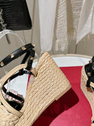 Valentino Garavani Taupe Wedge Rockstud Sandals 10mm In Black Calfskin And Beige Raffia 829385