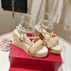 Valentino Garavani Taupe Wedge Rockstud Sandals 10mm In White Calfskin And Beige Raffia 829383