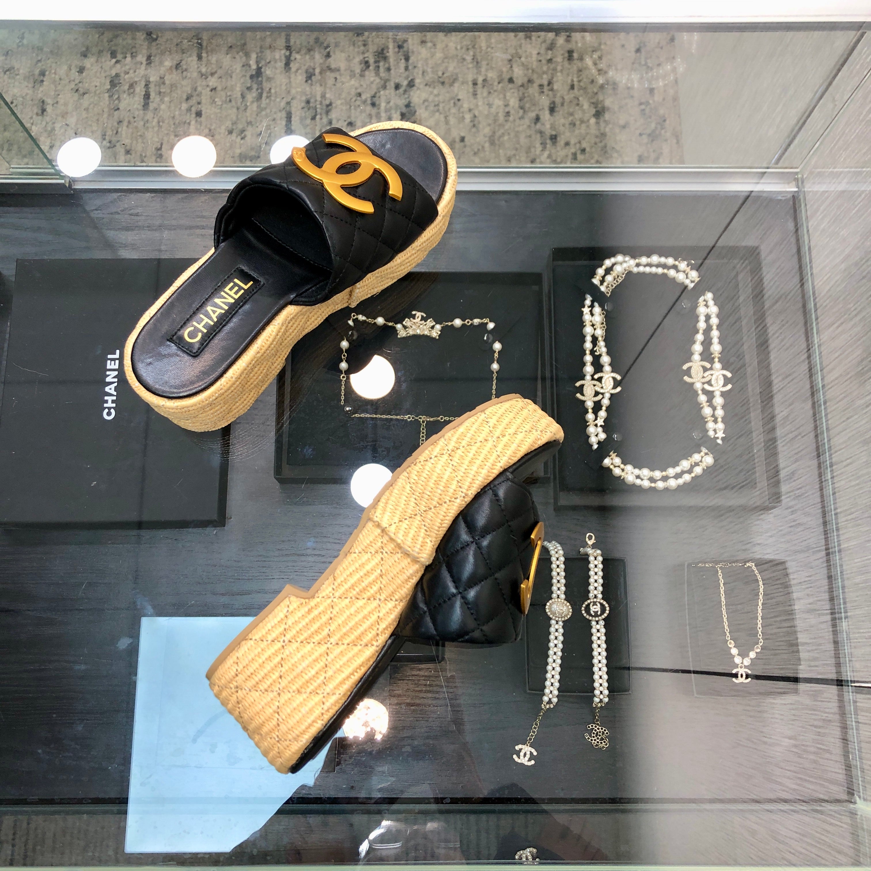 THICK SOLE WEDGE SLIPPERS IN BLACK LAMBSKIN AND BEIGE RUBBER
