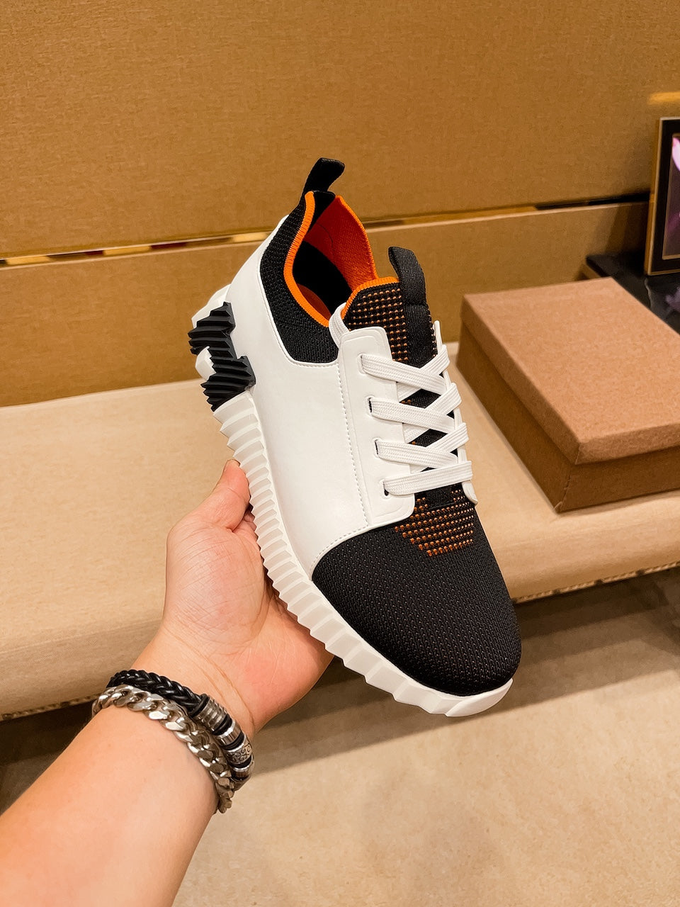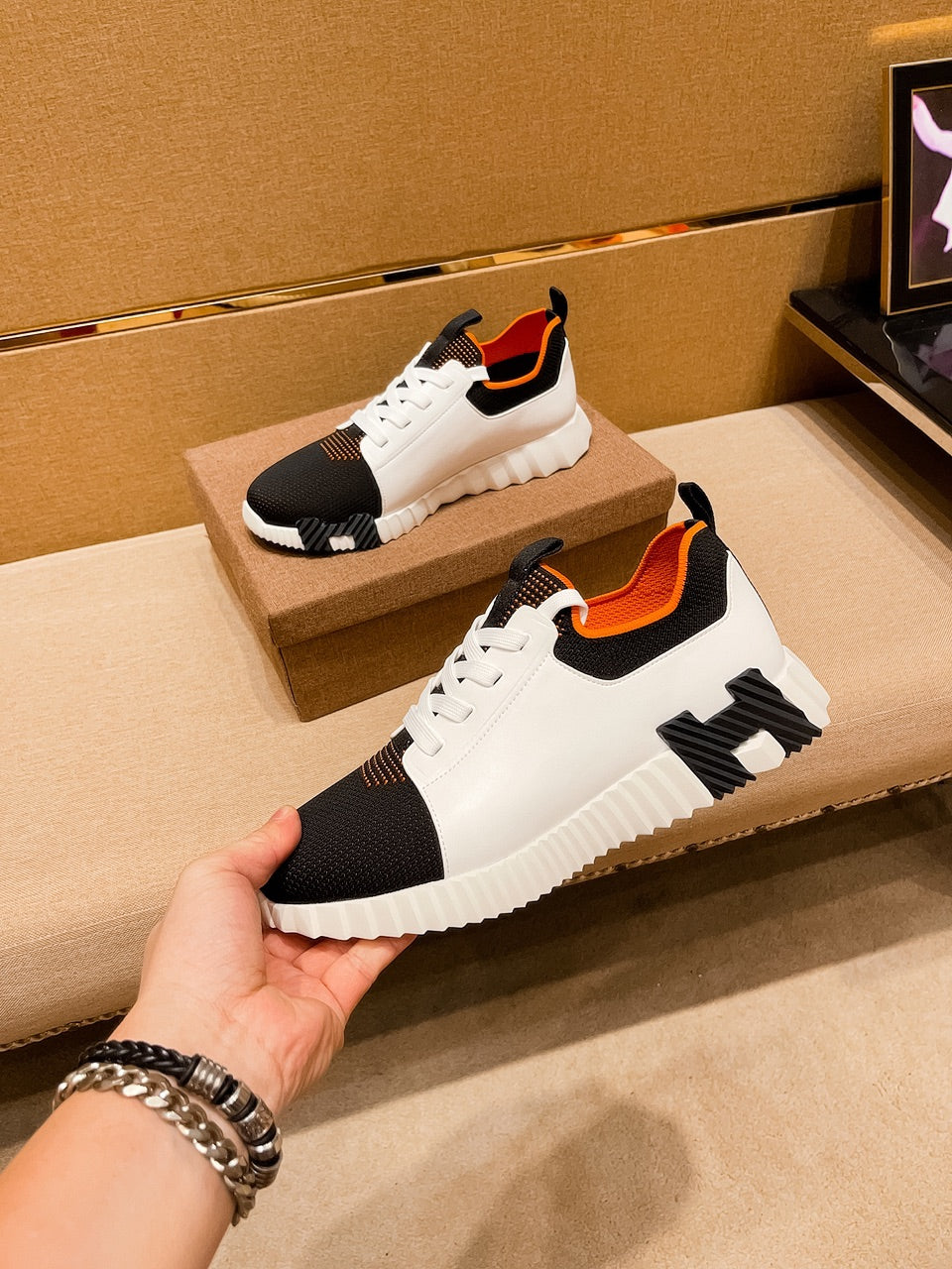 HM Men's Depart Slip-on Sneaker White Black Knit Cowhide 541299